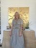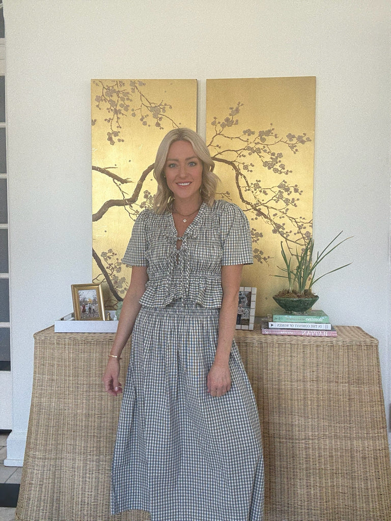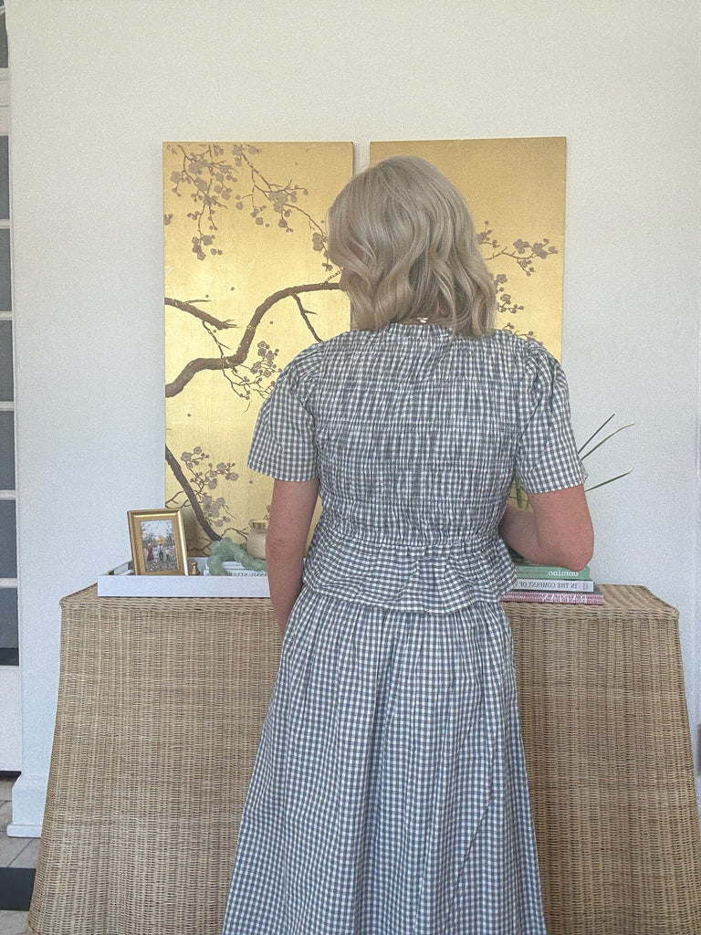 We are loving the neutral print of the Bliss Smocked Midi! This midi length skirt features a smocked waistline and gray and white check print.