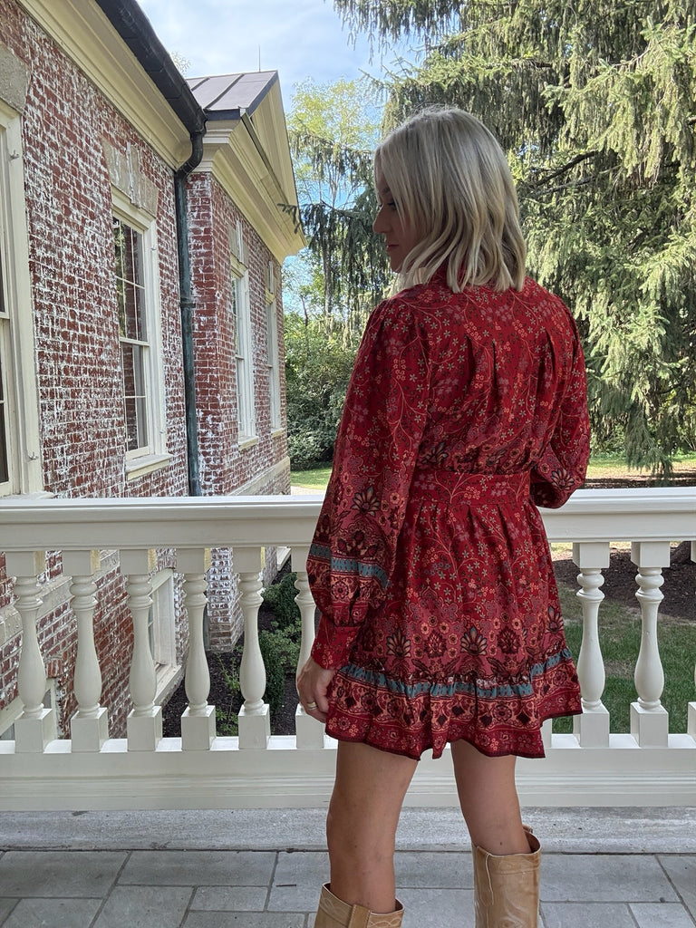 Stand out from the crowd in the Cooper Printed Dress! This auburn floral print dress features long sleeves, belted waist and a mini skirt hem. Style with your favorite boots for a look that is sure to wow!