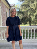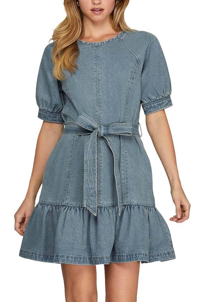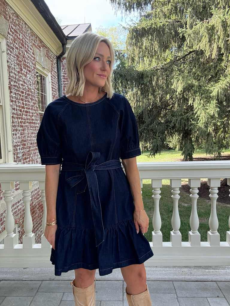 Fall family photos need the Harrison Belted Dress! This medium wash denim mini dress features short sleeves, ruffled hem and flattering belted waist. Style with your favorite booties for the perfect Autumn look.