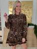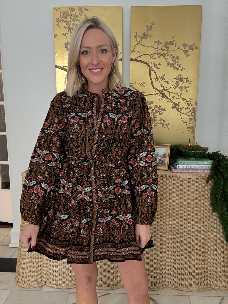 There is so much to love about the Miranda Border Print Dress, but our might just be the color pallet! With its fall toned print material shaping this mini dress with long sleeves and belted waist this piece is at the top of our must have list!