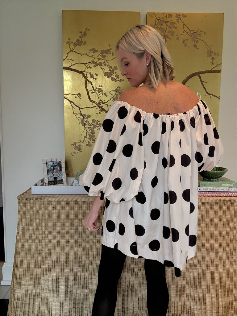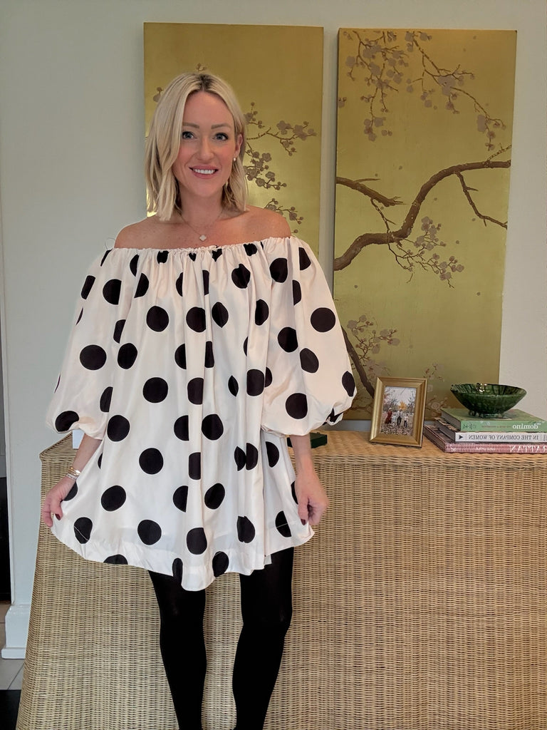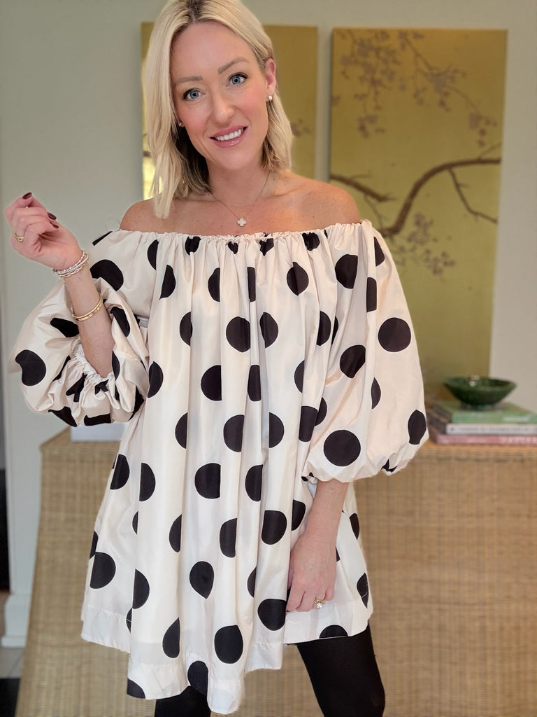 Show off your style with the Zella Polka Dot Dress! With its cream and black bold polka dot print, puff half sleeves and mini skirt hem you'll be catching everyone's eye.