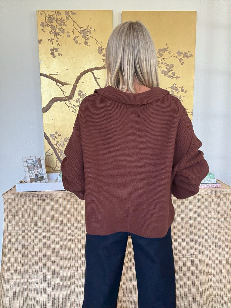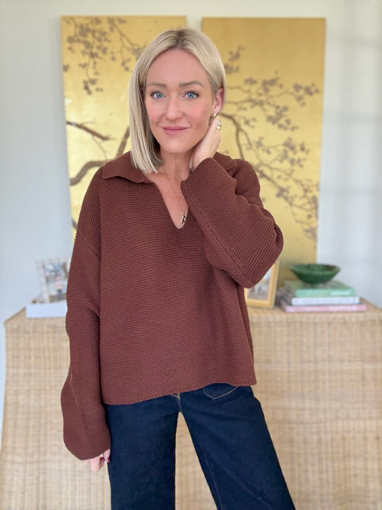 Match any Fall vibes with the Alyssa Collar Sweater! This deep brown colored knit features a relaxed fit, long sleeves and collared neckline. Dress up or down to match the occason.
