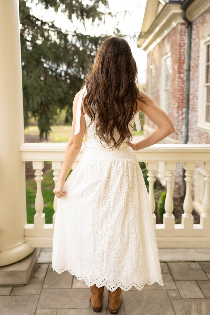 We are loving the classic look of the Bailey Eyelet Top! This white eyelet lace top features a sleeveless bodice, slightly cropped hem and bow tie shoulder straps. Wear with your favorite jeans or the matching skirt for many ways to wear.