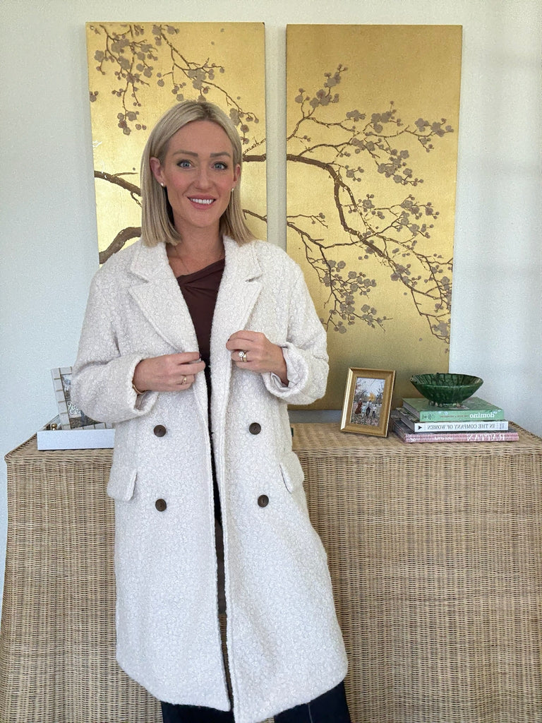 Do outerwear in style with the Barley Boucle Long Coat. This cream textured coat features a long hemline, long sleeves, and collared neck with front button closures.