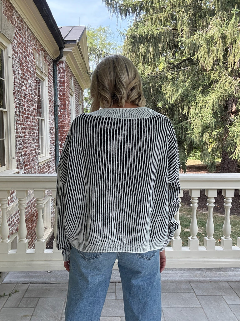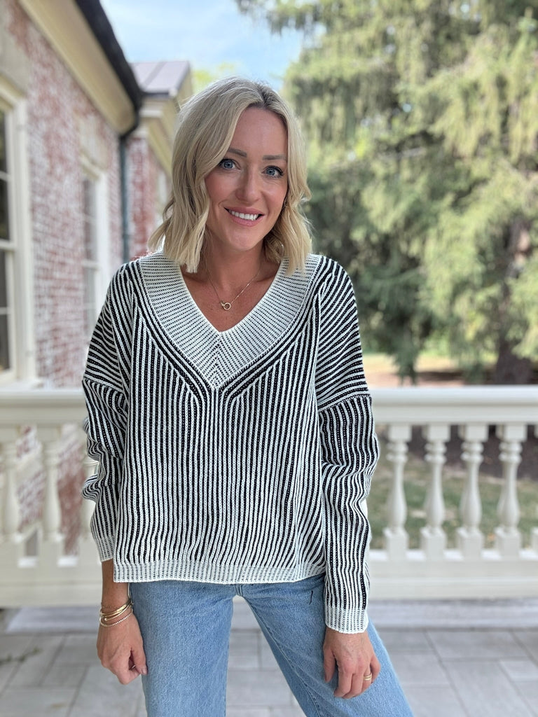 This chunky knit will have you looking stylish and feeling comfy all season long. Featuring a black and white ribbed knit, relaxed fit, and v neckline the Bekah Stripe Sweater might just be one of our favorites of the week!