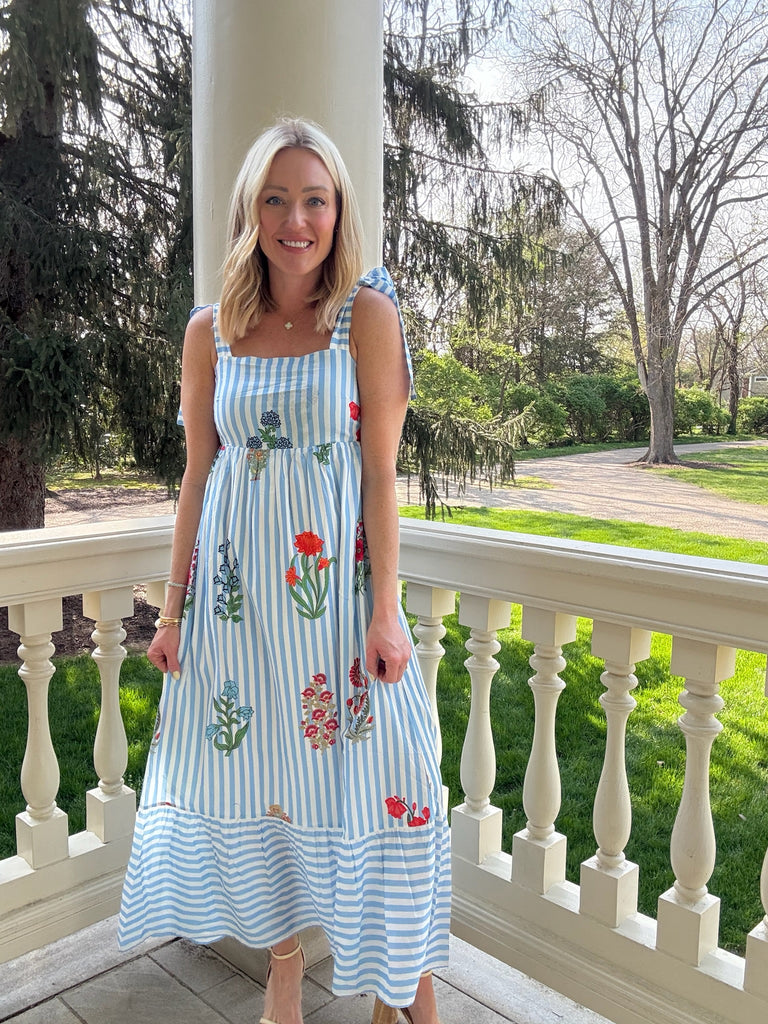 The Blake Stripe Floral Dress is the perfect dress for any summertime event! With its light blue and white stripes with floral accents throughout, tiered midi skirt, and tie straps this piece is ultra versatile.