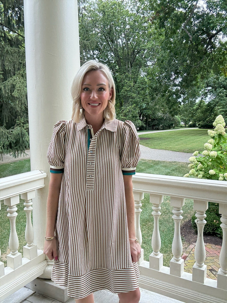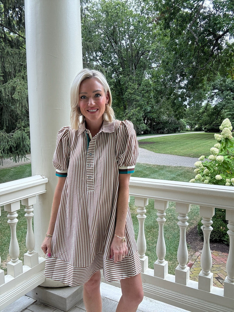 We are loving the contrasting-colored stripe on the Cameron Stripe Dress! Stripe pattern short puff sleeve swing shirt dress with accented multicolor rib band. Collar button closure. Lined. Woven. Non-sheer. Lightweight. Style with your favorite booties for a Fall ready style.