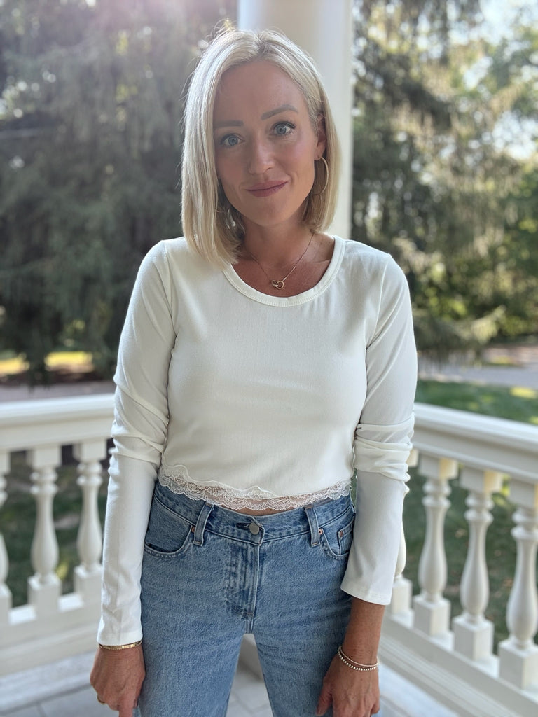 Add a touch of lace to your look with the Capri Lace Trim Top! This cropped long sleeve top in white features lace trim along the hem. Style alone with your favorite denim or as a part of a layered look for many ways to style.