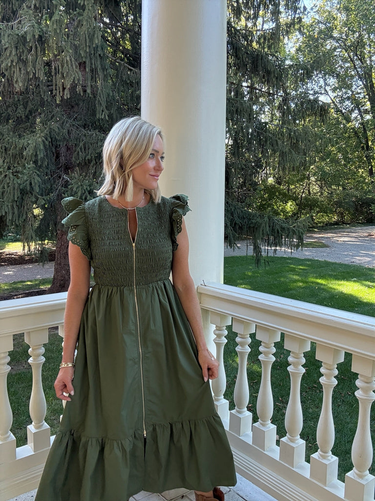 We have been loving the zipper dress look so much we had to bring it back with a twist! Featuring a deep olive green color, front zipper closure and eyelet ruffle sleeves the Cassie Eyelet Zipper Dress is a must have.