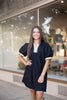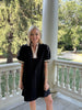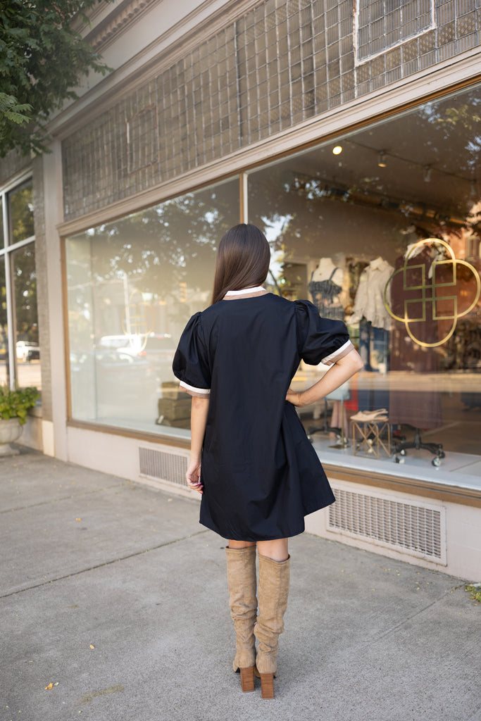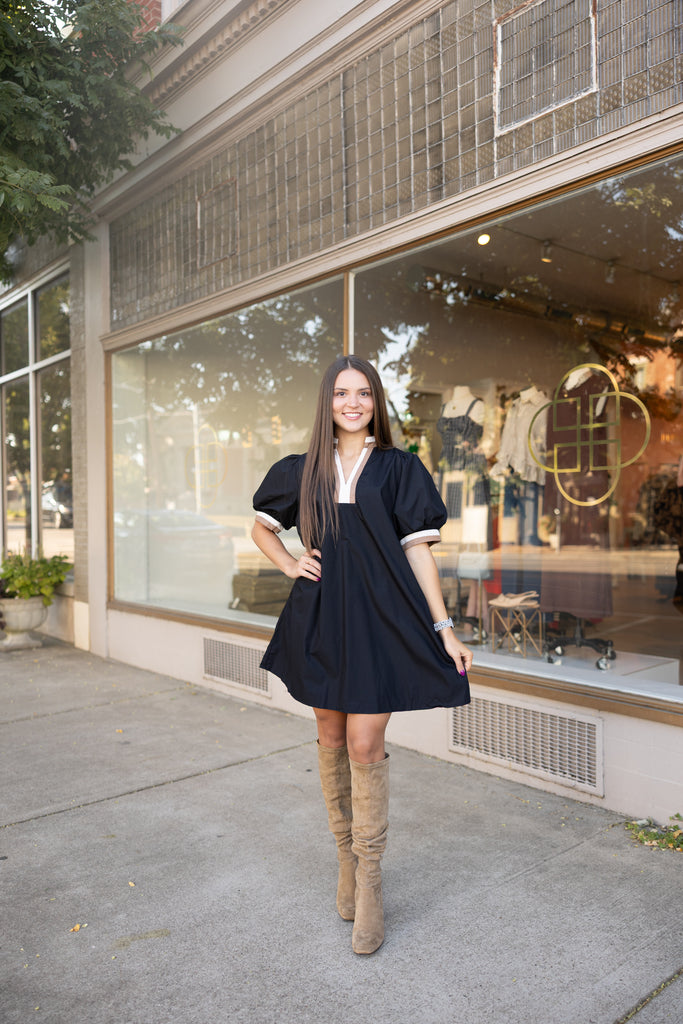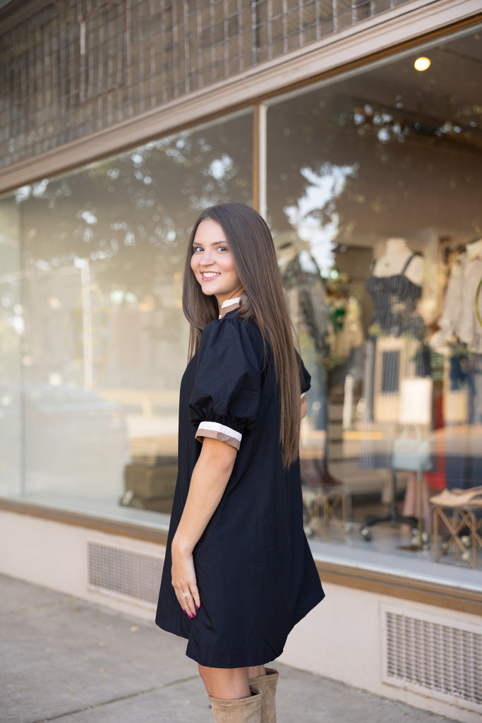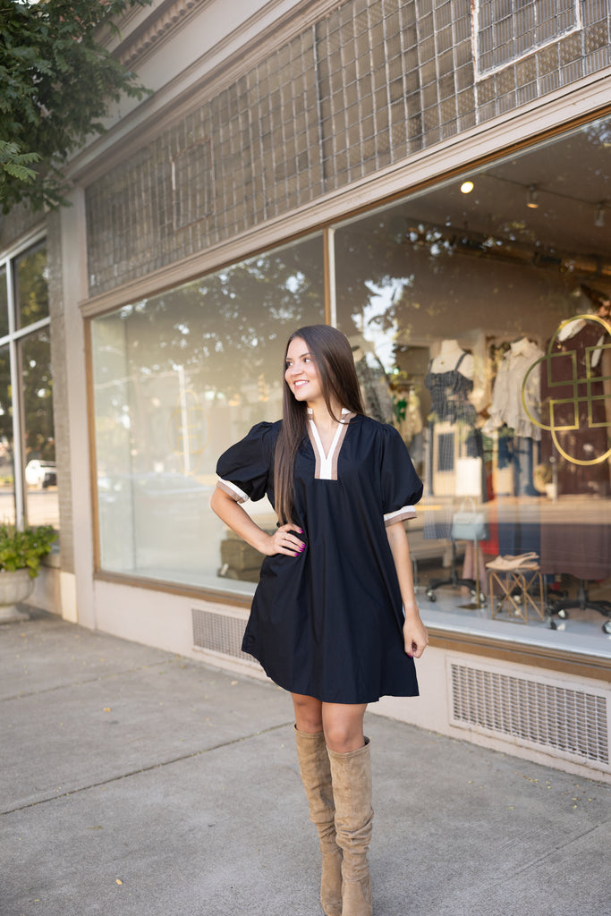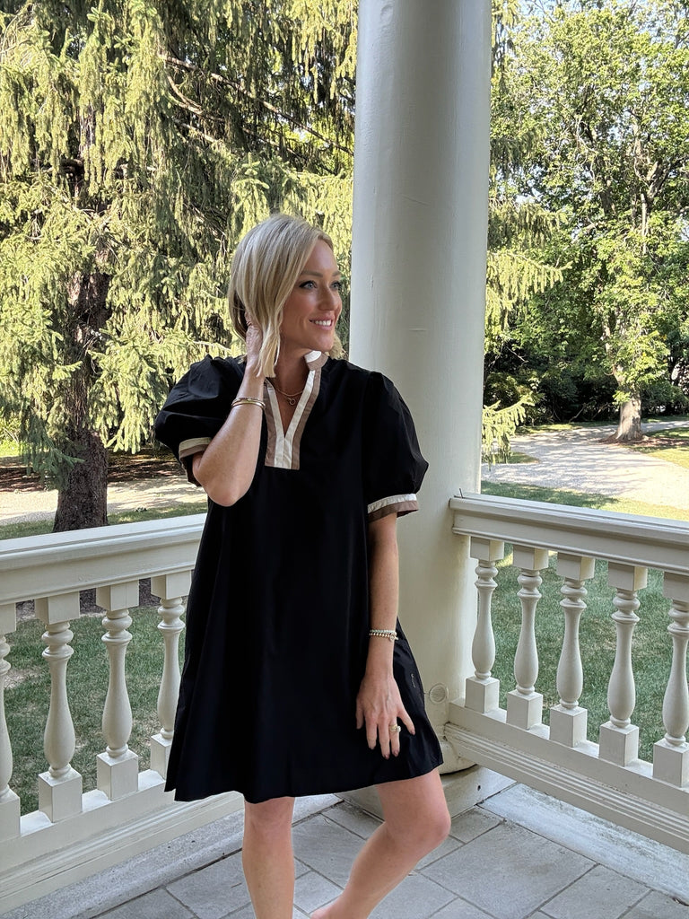 Your next favorite little black dress has arrived at Dress & Dwell! Solid short sleeve pullover mini dress featuring multicolor band accent. Pockets at sides. Lined. Woven. Non-sheer. Lightweight.