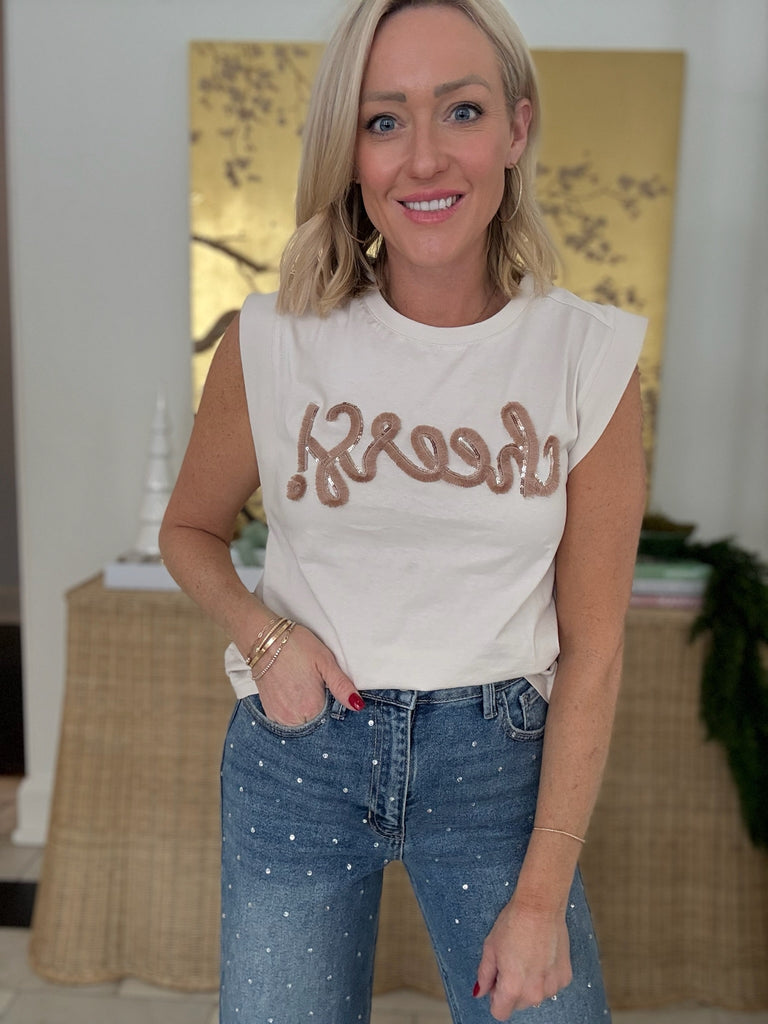 You'll be ready to celebrate everywhere you go in the Cheers Embellished Sleeveless Top! Featuring a white sleeveless design with sparkle embellishments on the front, this piece is sure to bring on the fun!