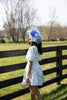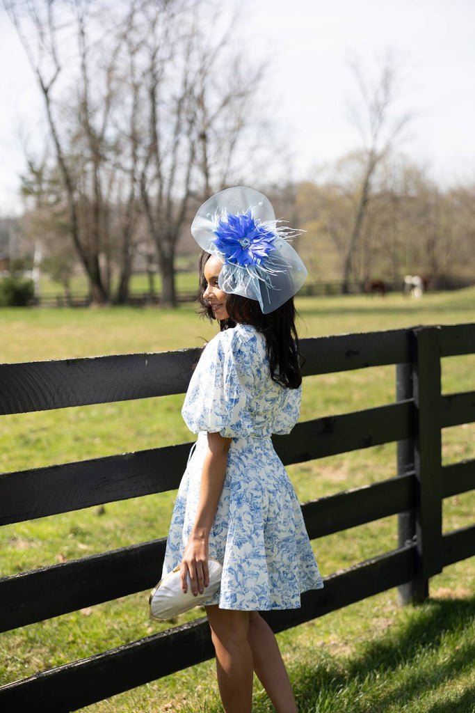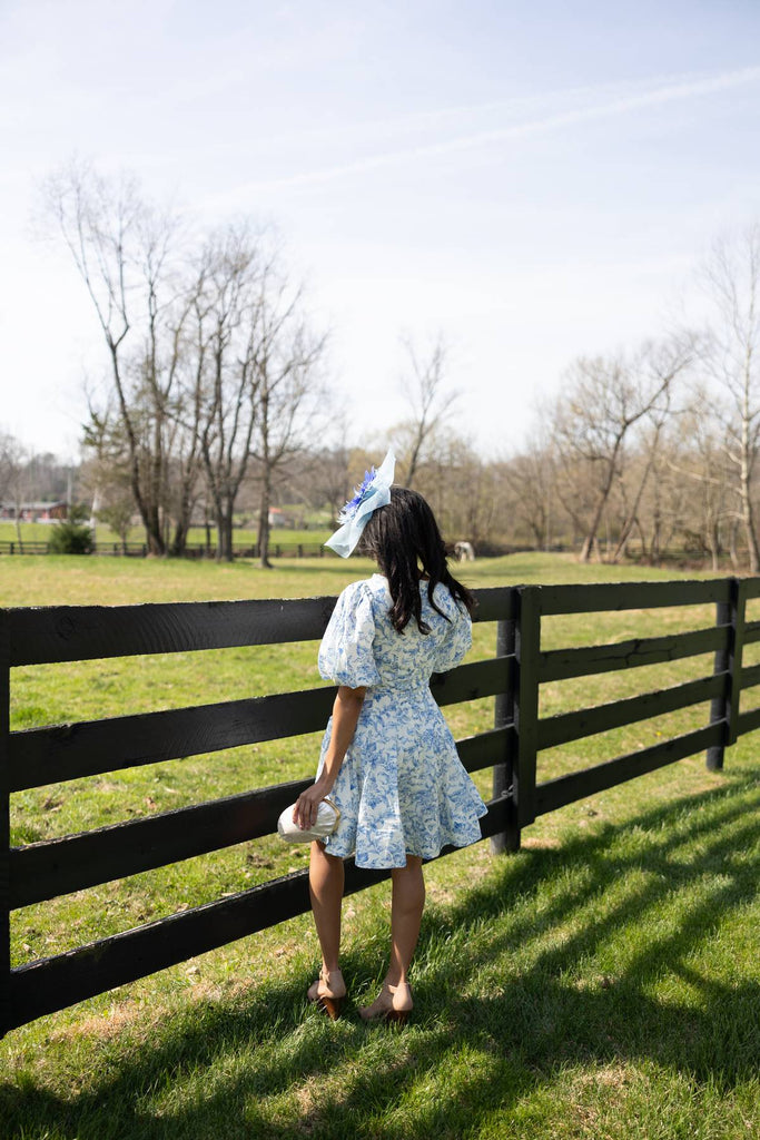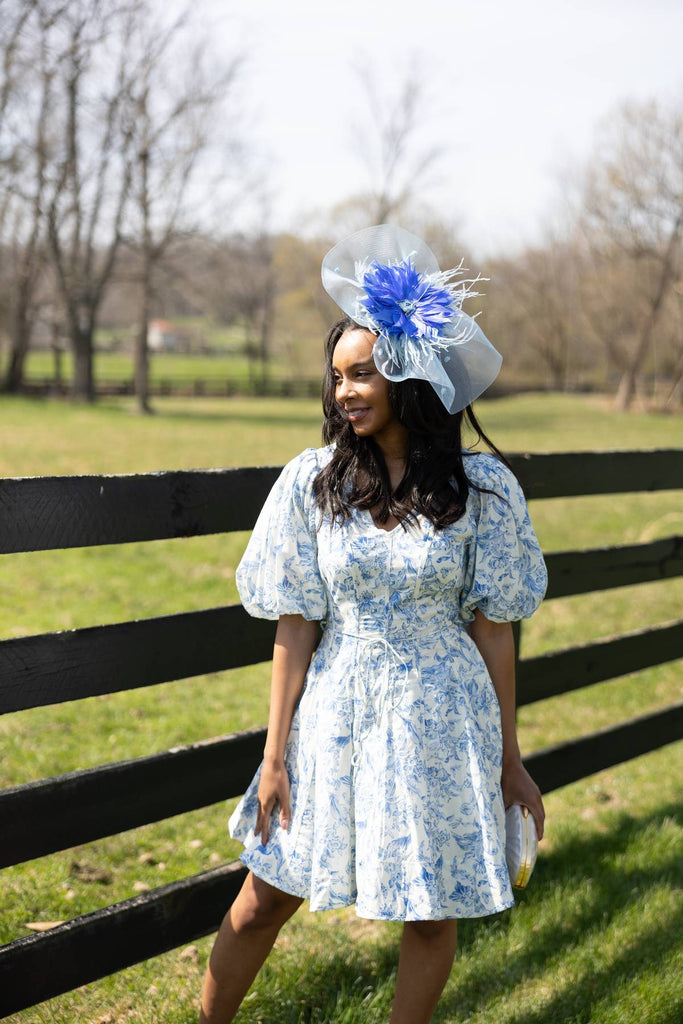 Whether you're going to Easter brunch, a girls day or Churchill Downs do it in style with the Clare Printed Mini Dress. This off white and blue floral boned structured bodice, short puff sleeves and v neckline.