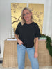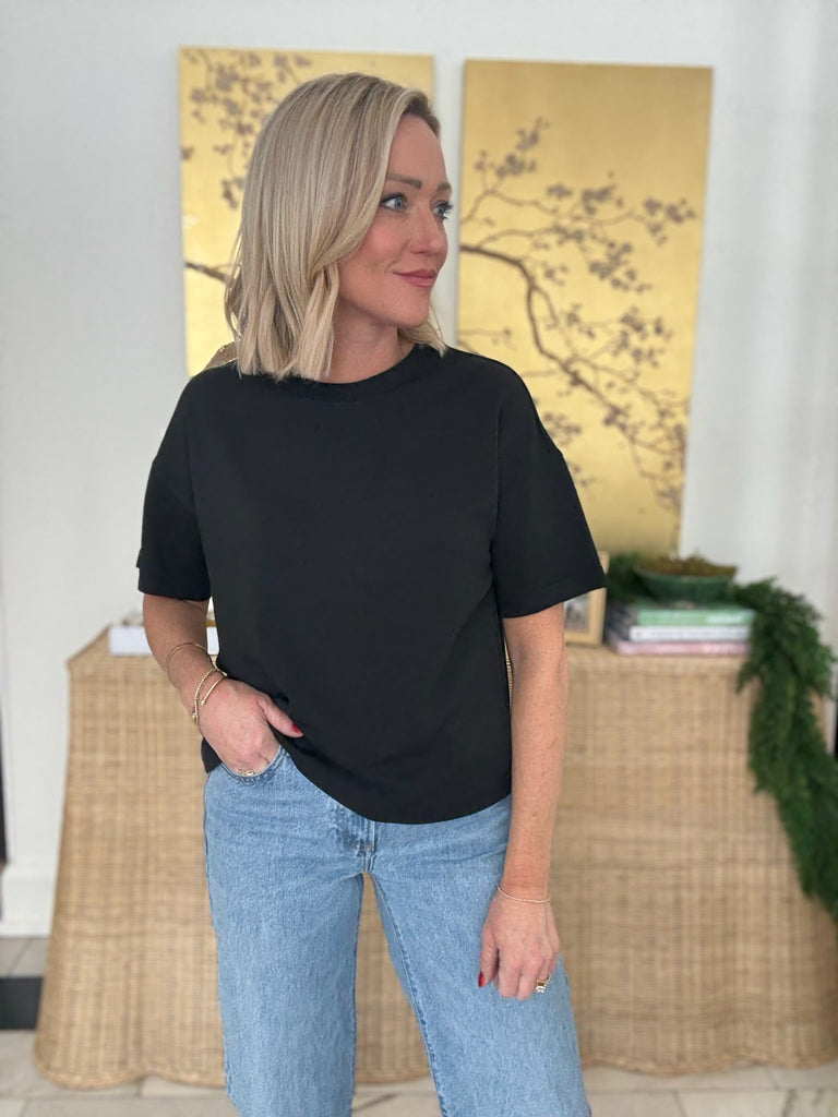 If you are looking for a basic tee to add to your collection you need the Corrie Tee. This solid black scoop neck short sleeve tee is an ultimate basic.