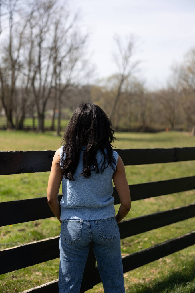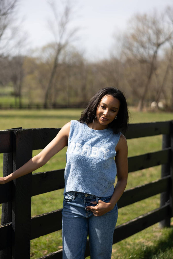 Make a statement this season in the Derby Sweater Tank! This plush blue tank has graphic derby written on the bodice.