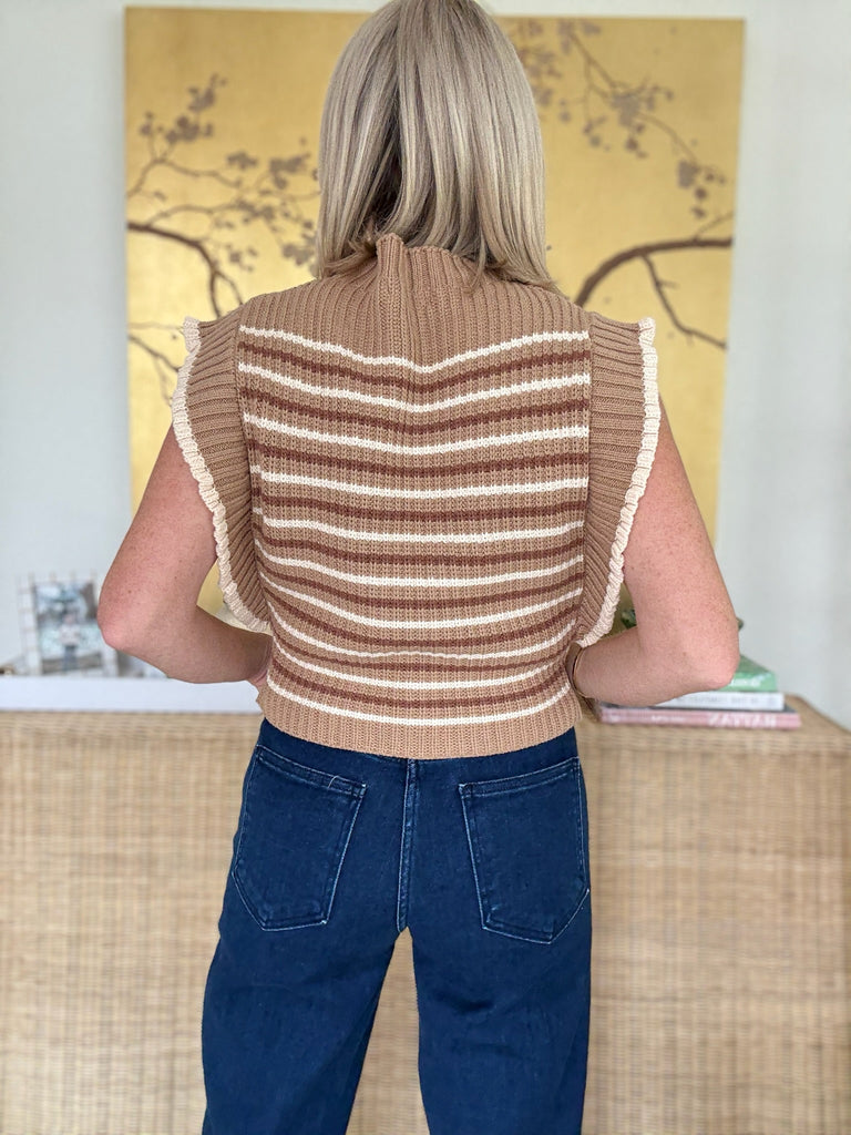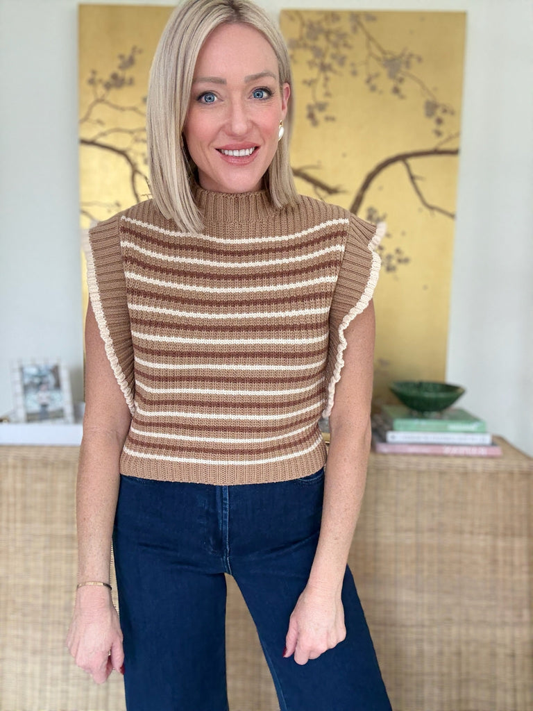 We are loving the neutral stripe look of the Eleanor Sweater Top! With its tan and cream stripe knit, high neckline and ruffled sleeves this piece is the perfect piece to add to your Fall wardrobe.