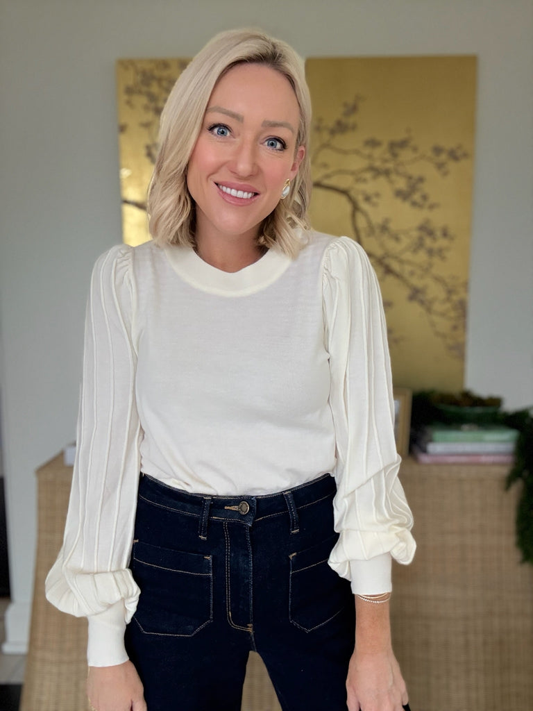 Basic and cozy, the Expectation Stripe Sleeve Sweater is a closet essential! Soft and slightly stretchy knit shapes this sweater with a  high neckline, long sleeves with drop shoulders, and a relaxed boxy bodice. Contrasting knit detail on the adds a unique vibe.