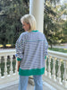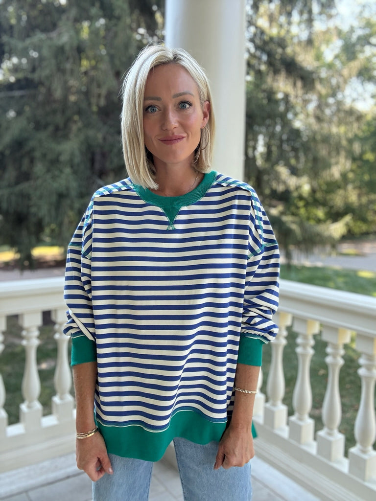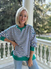 The cozy Felicia Stripe Sweater is calling your name! With its blue striped bodice, and teal blue pop of color along the hem, neckline and cuffs, this pullover is so comfortable and stylish you'll be wearing it all season long.