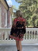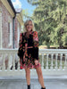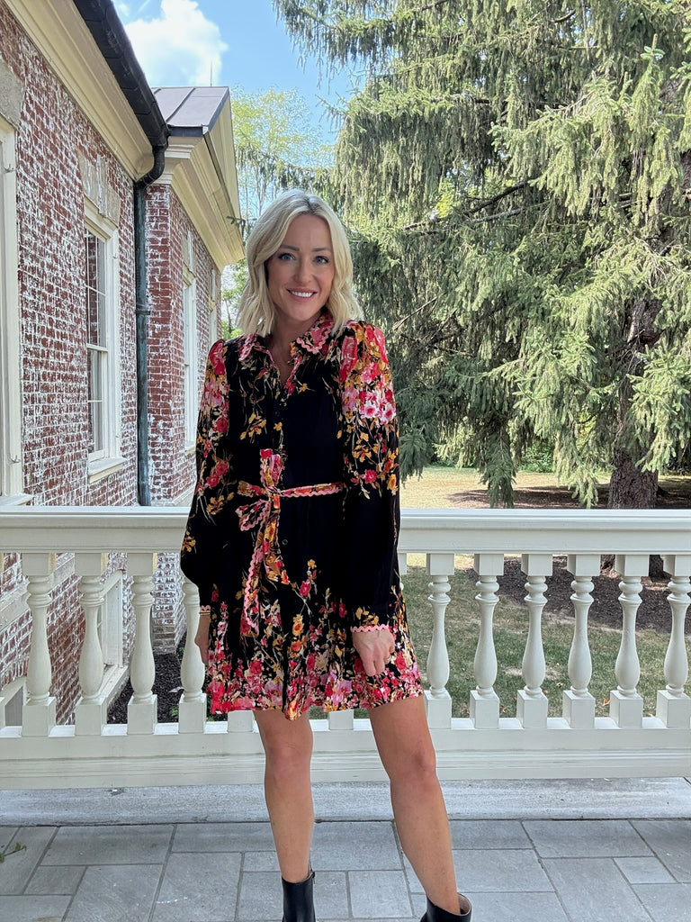 Stand out from the crowd in the Florence Floral Belted Dress! With its black material with multicolored florals, long sleeves and belted waist this dress is perfect for a Fall wedding or event.