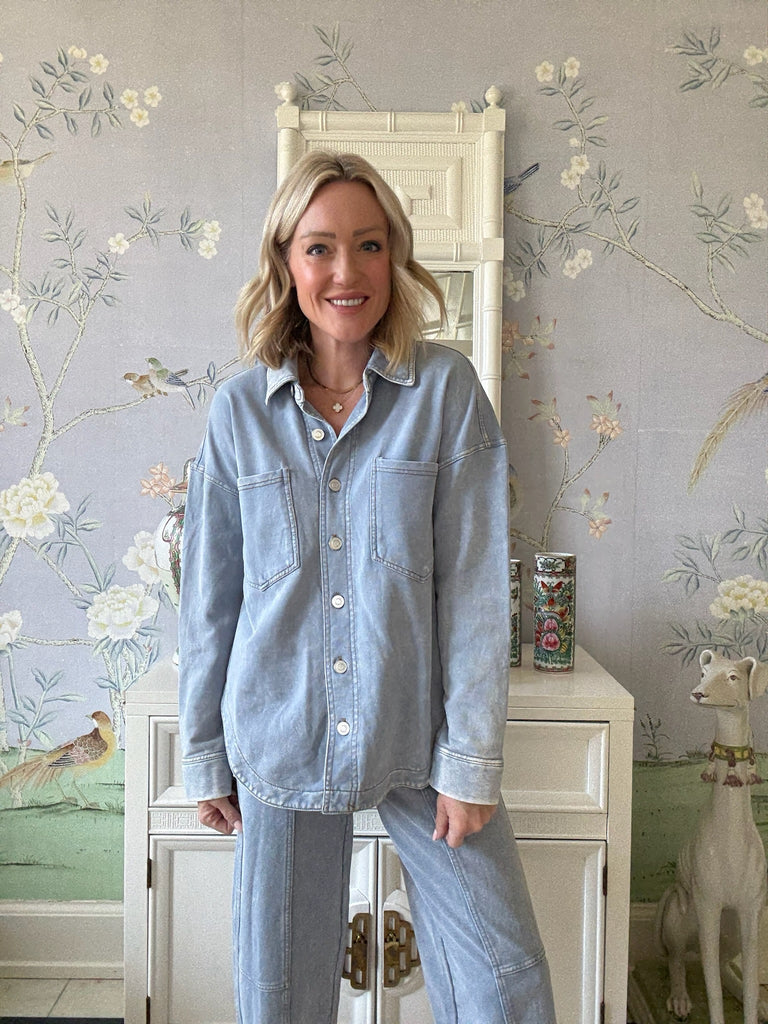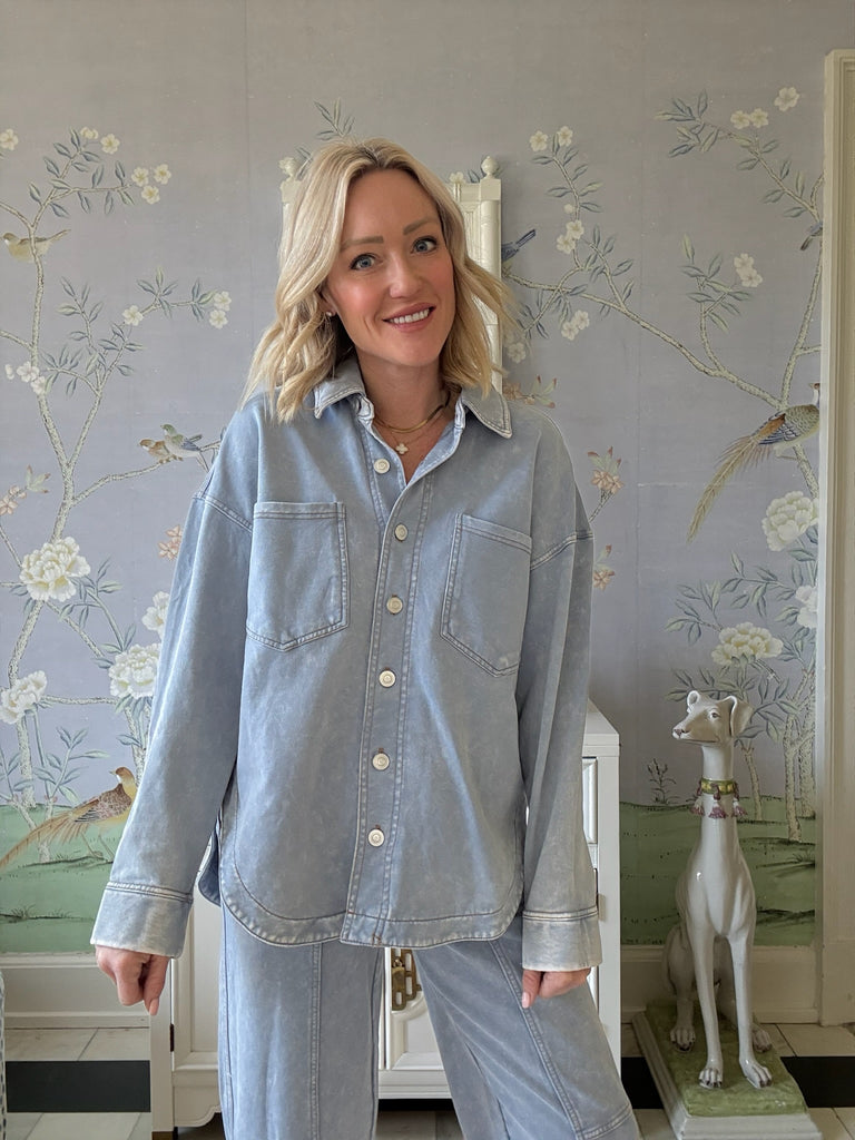 Keep things cool in the Hadley Acid Wash Shacket! This light wash denim shapes a long sleeved shacket with collared neckline and font button closures.