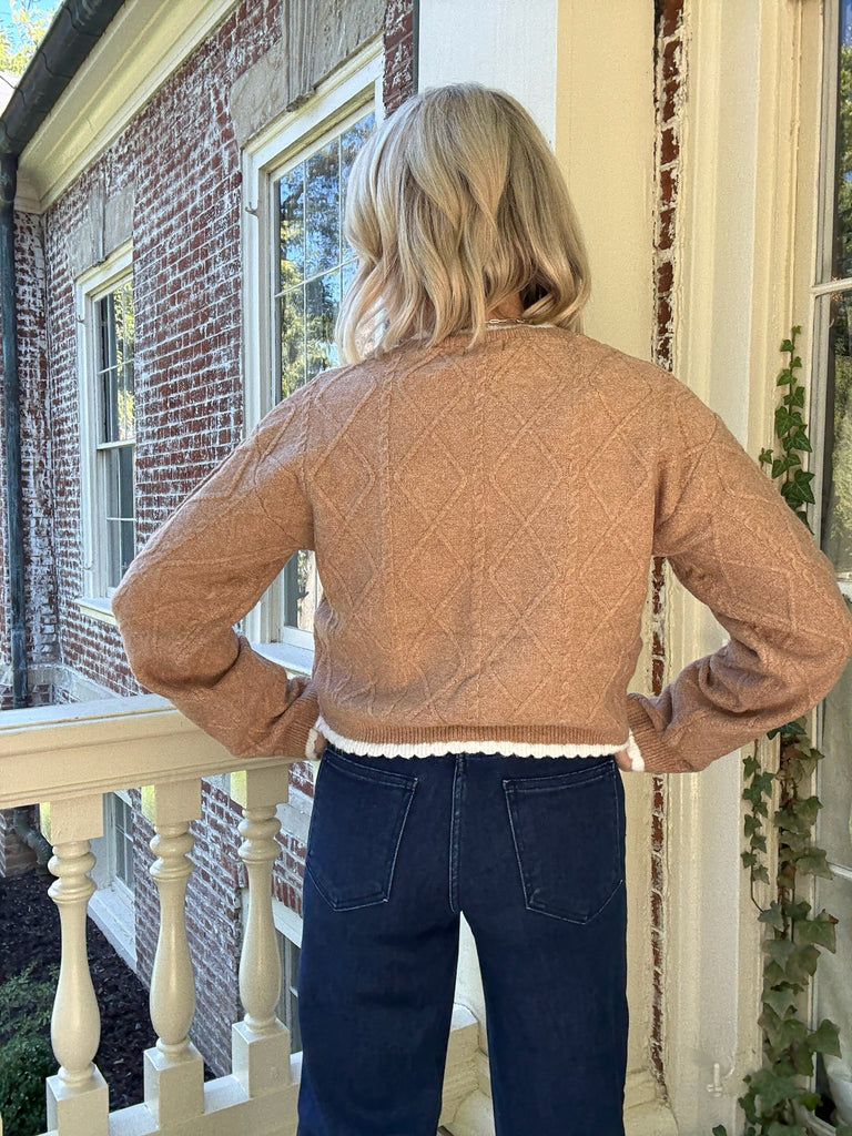 We are loving the girly touch of the Harrison Scalloped Edge Sweater. With its classic tan knit matieral with textured bodice, long sleeves and slightly cropped hemline this piece is a Fall must. Scalloped edges take this basic look to the next level.