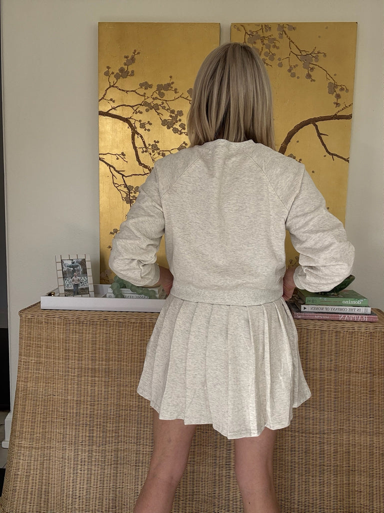 You will be that girl when you walk in wearing the Herkie Pleated Skirt Set. This cream set features a pleated mini skirt and long sleeve pull over. Wear together or separate for an ultra chic look.