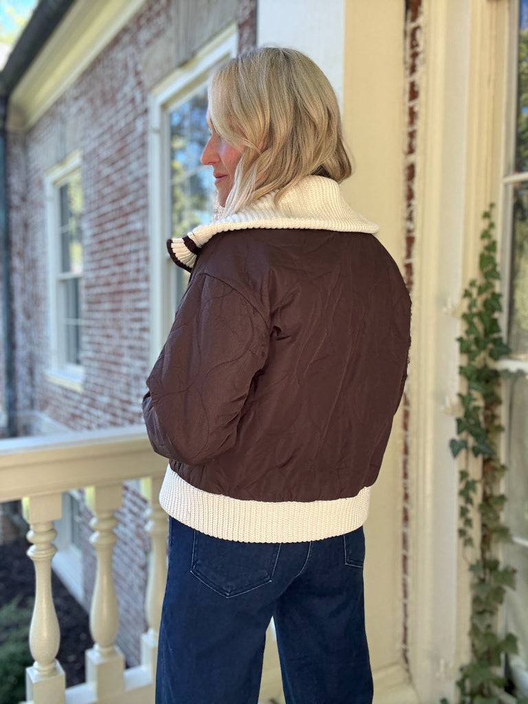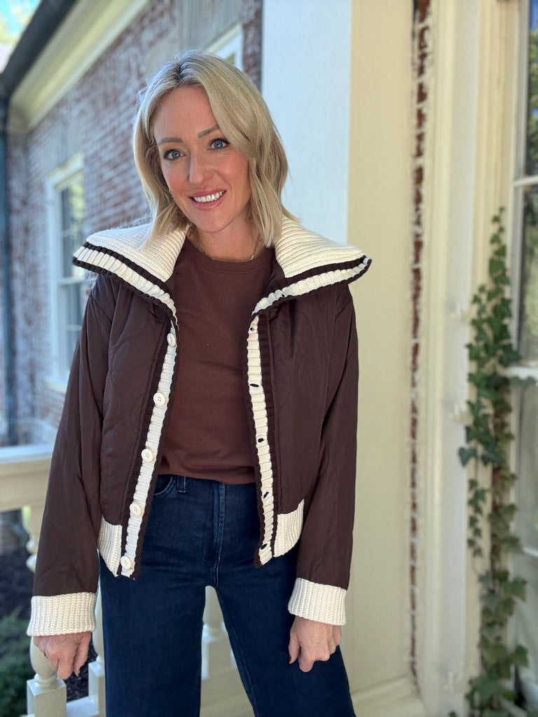 You'll love how comfy and stylish you'll feel in the Jordette Jacket! This chocolate brown lightweight quilt material shapes this long sleeve jacket with cream ribbed details and front button closures.