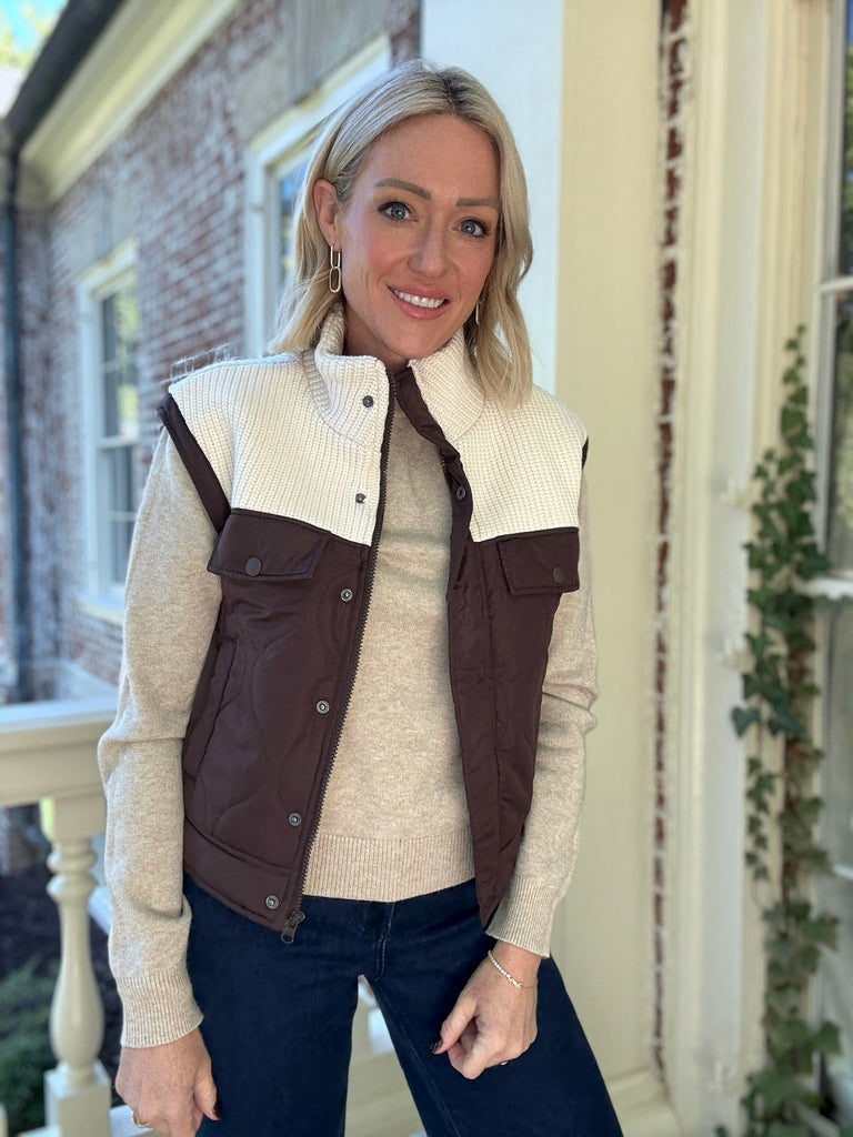 Bundle up in style with the Jordette Vest! This brown puffer fest features cream ribbed knit and front zipper closures.