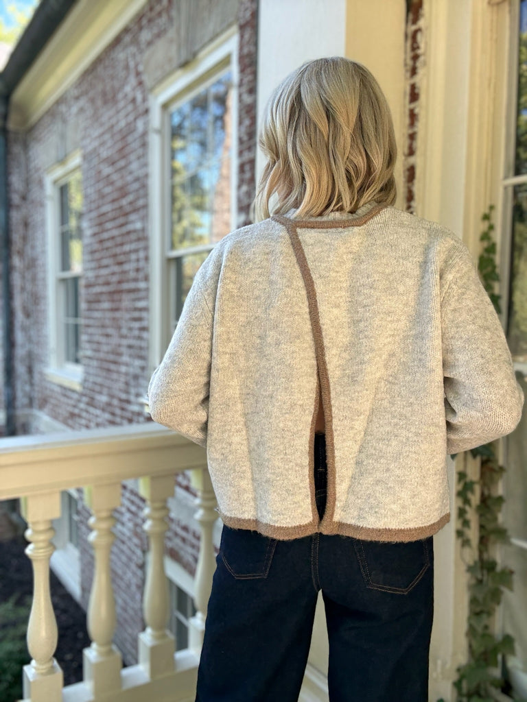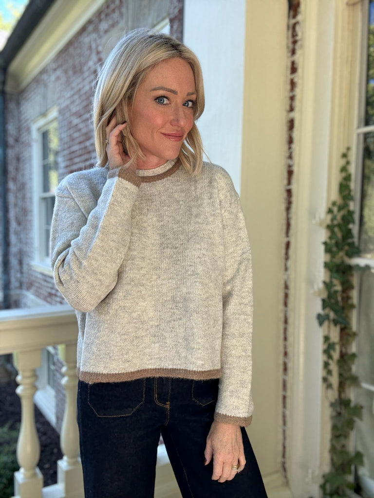 Take your Fall sweater game to the next level with the Juniper Contrast Sweater Top. This cream sweater features long sleeves, slightly cropped hemline and camel colored piping along the edge.
