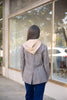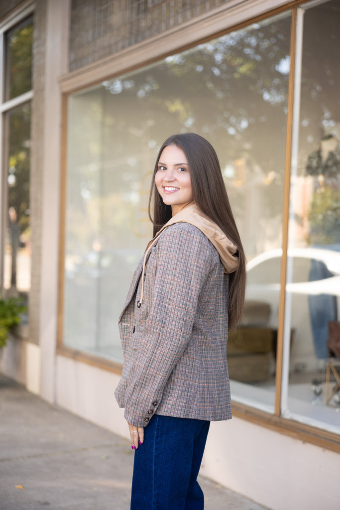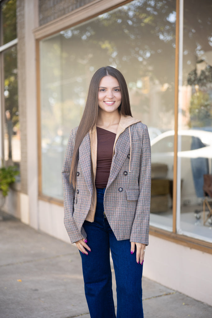 Your layered look needs the Kallie Herringbone Blazer. This tan herringbone material shapes this button front closure jacket with contrasting tan hood.