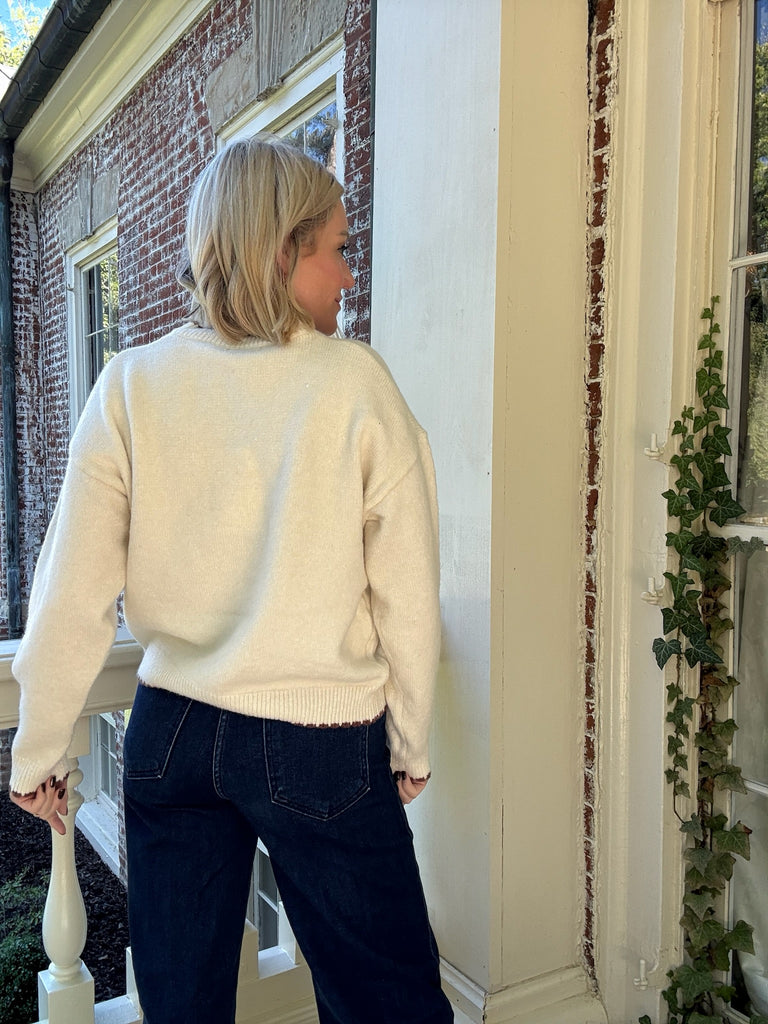 Add a little touch of brown to your look with the Karina Scalloped Edge Sweater. This cream sweater features long sleeves and crew neckline with scalloped brown edges.