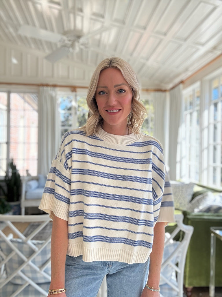 The Kelly Stripe Sweater Top is so soft, you'll want to wear it over and over. With its blue and white stripe knit material and short sleeves this piece is an instant add to cart!