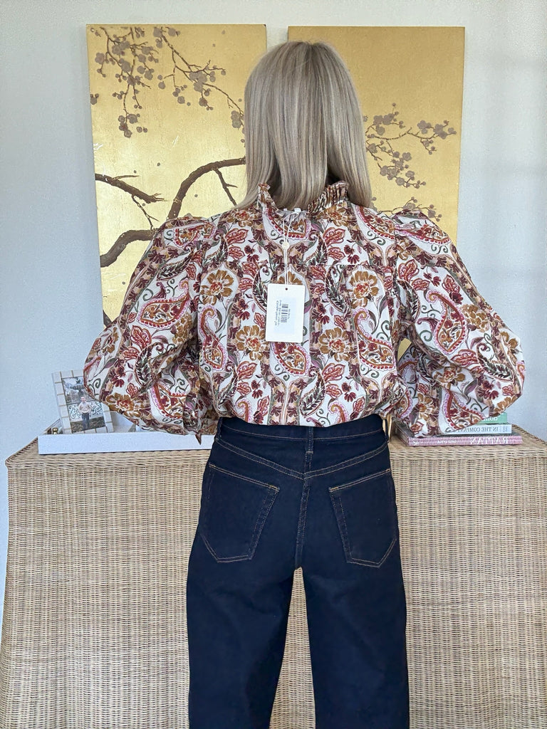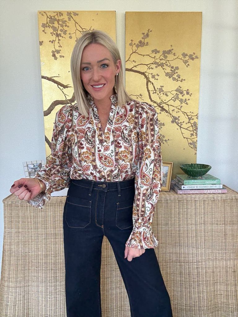 Fall colors + a fun print = a must have look! The Kittridge Paisley Top features a fall hues print material, ruffled neckline and long sleeves with ruched cuffs. Style with your favorite denim and booties for a ready to wear look.