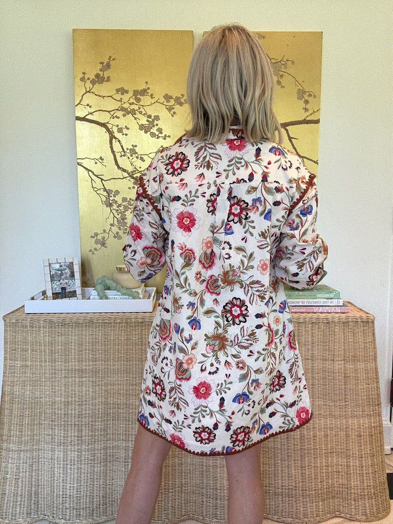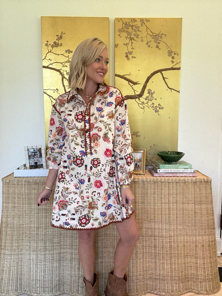 The Layla Print Dress is here to add light and color to your Fall wardrobe. With its airy material with multicolored floral throughout, long sleeves and camel colored stitching this piece is sure to be a best seller!