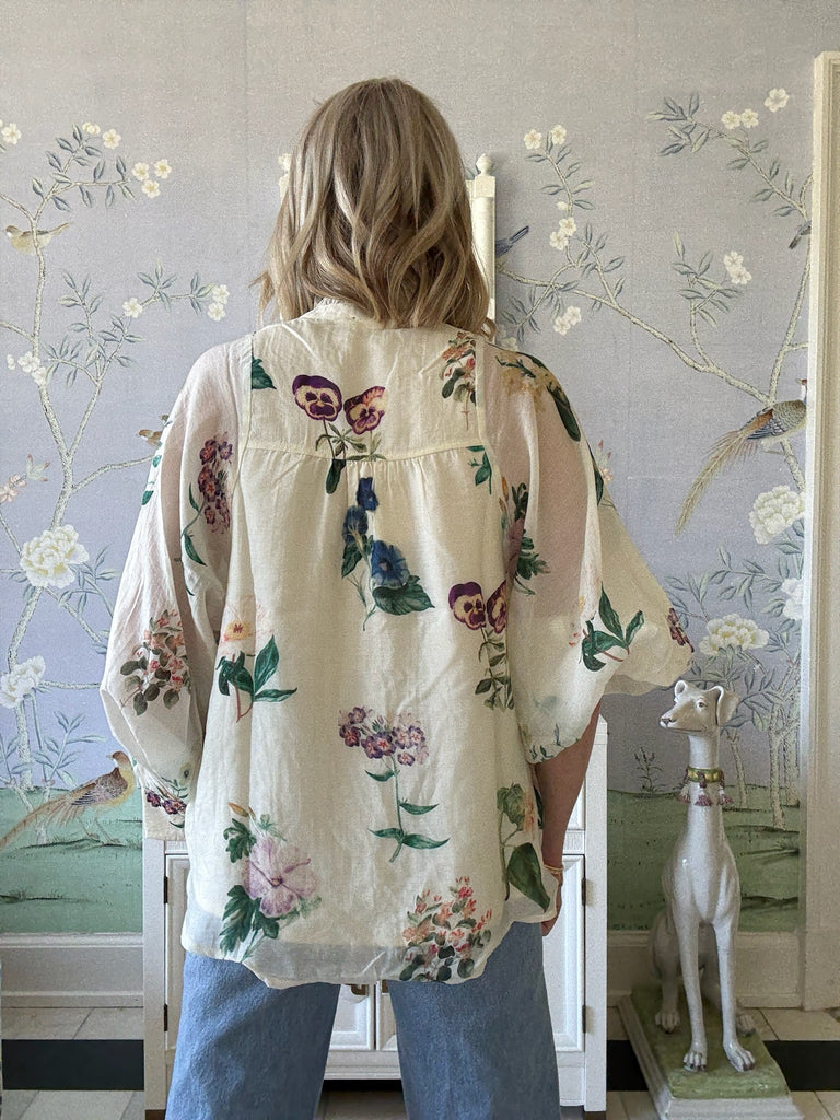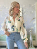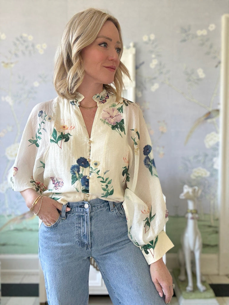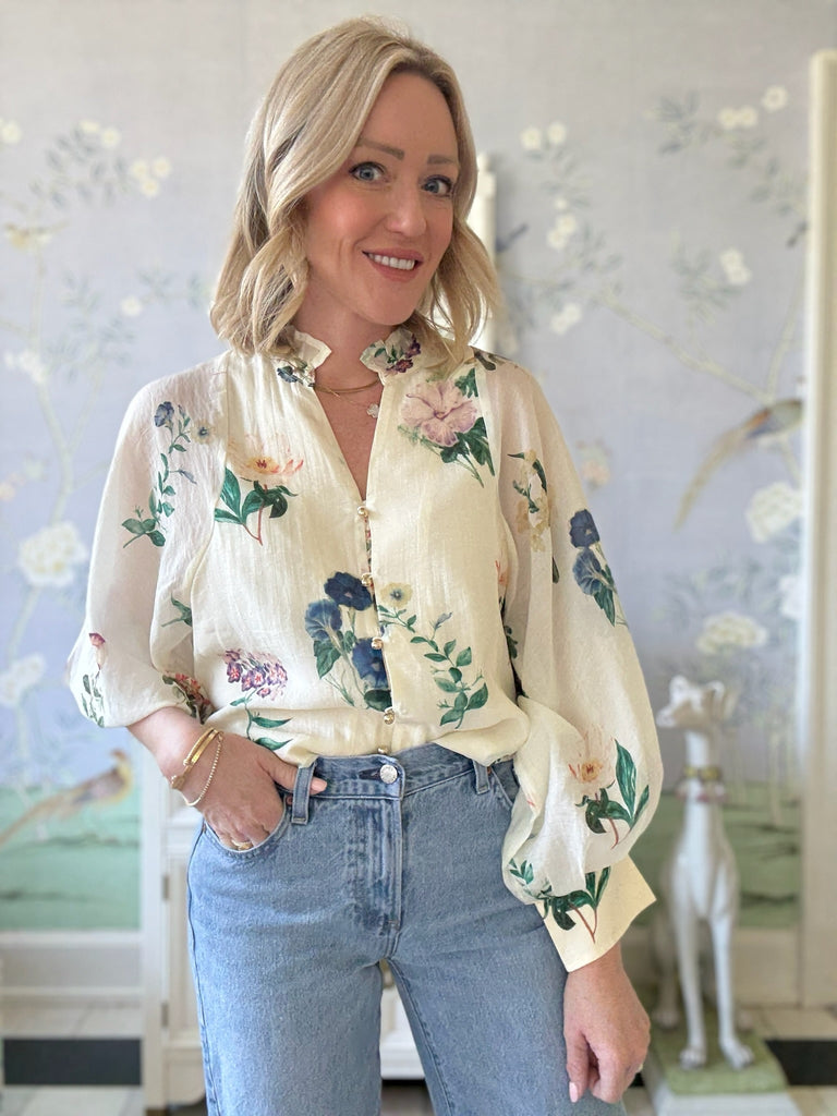 Make a statement in the Loretta Floral Top. Floral print long puff sleeve top featuring ruffled neck and button closure at front. Buttoned cuffs. Lined. Woven. Semi-sheer. Lightweight.