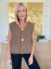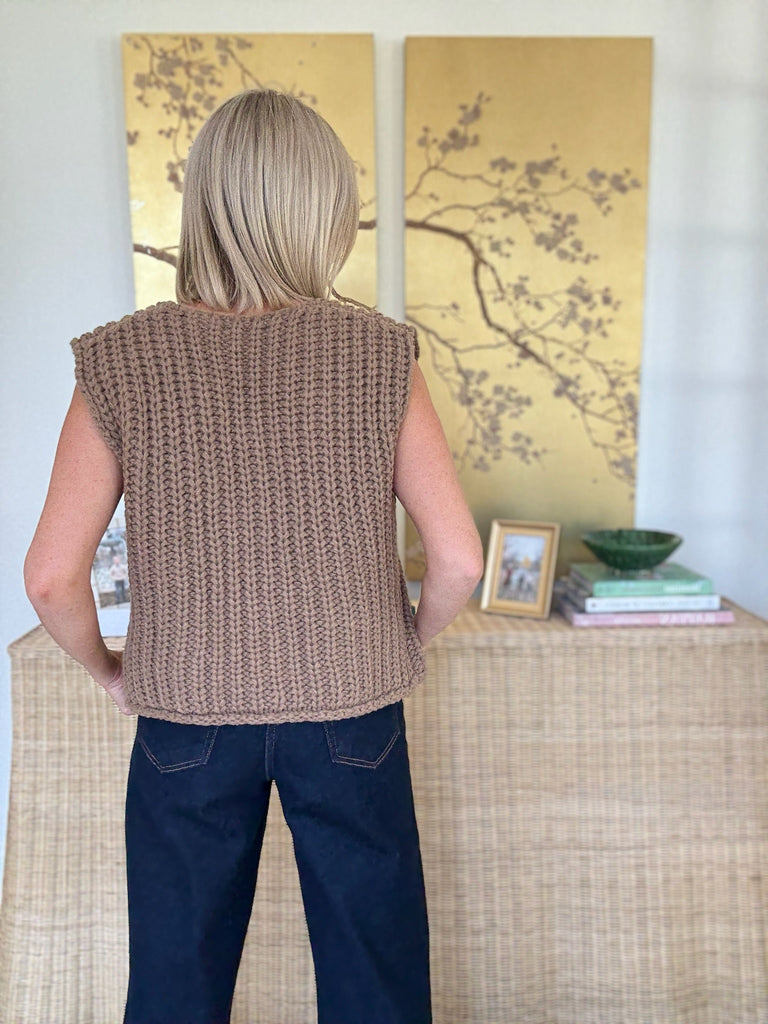 Take your layered look to the next level with the Maggie Chunky Sweater! This sleeveless piece features a soft brown knit, and front pockets and button closures.