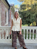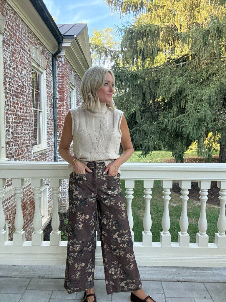 If you are looking for a unique pair of pants to add to your denim collection you need the Marlow Floral Denim. With its chocolate brown floral print, wide legs and standard button closures this piece is a must have for Fall.