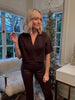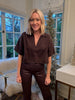 If you are looking for a throw on and go piece, the Penelope V Neck Top is for you. This chocolate brown piece features short sleeves, collared v neckline and cropped hem. Style with your favorite jeans for a ready to go look.