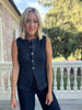 Show off your love of denim with the Petra Button Up Vest! This dark wash denim vest features gold front button closures and fitted bodice. Style with your favorite bottoms or with the matching bottoms for many ways to style.