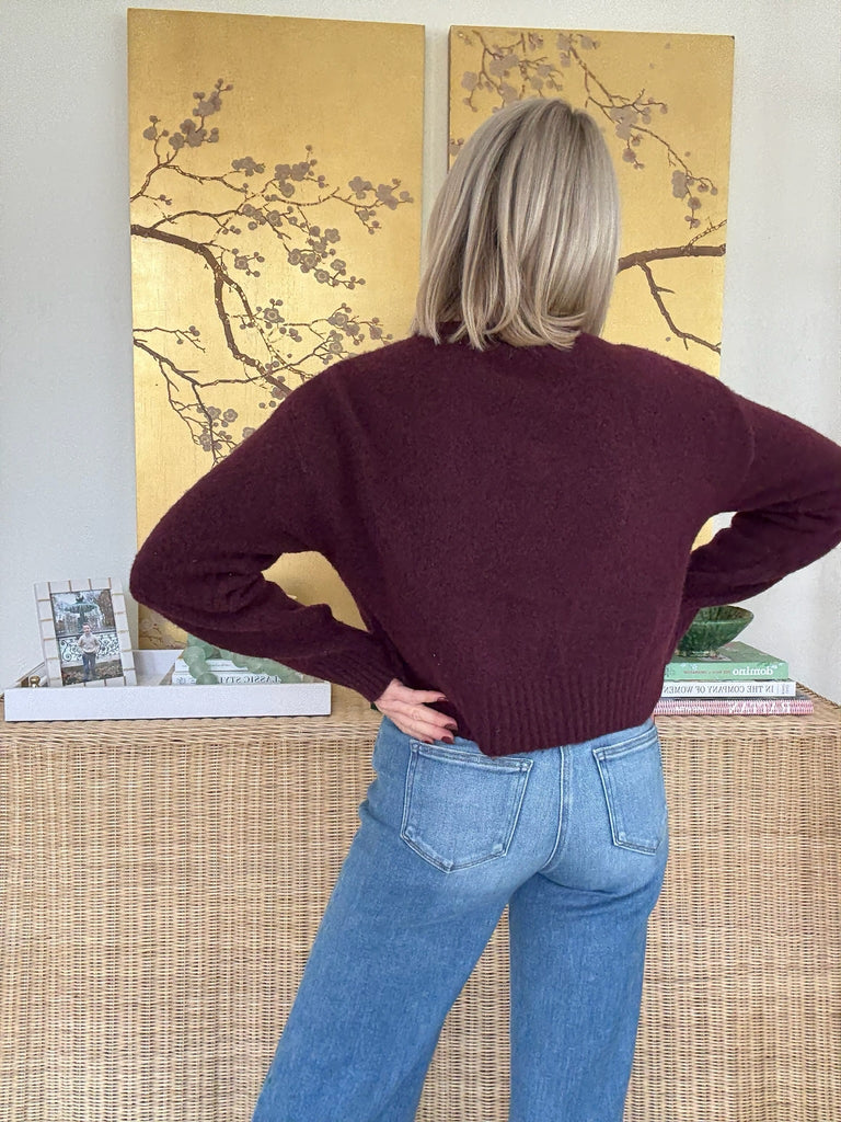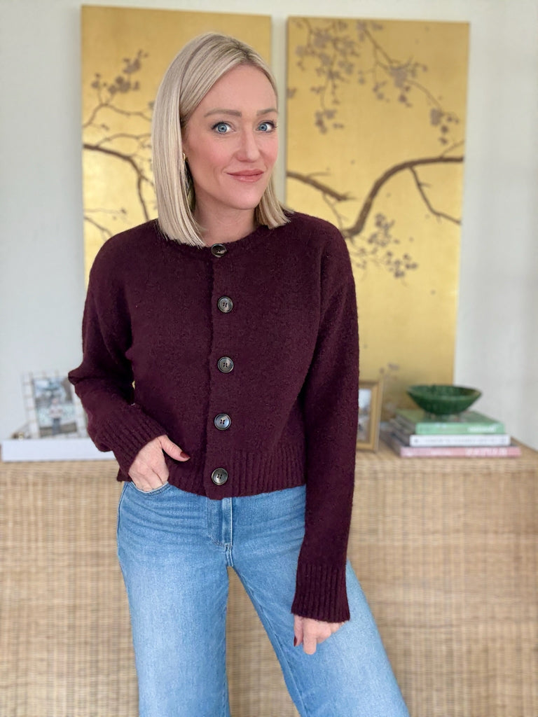 The Redwood Button Up Cardigan is the epitome of Fall. With its wine red knit, long sleeves and large button accents this piece is a must have. Wear it with your favorite denim for an easy to wear look.