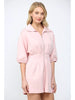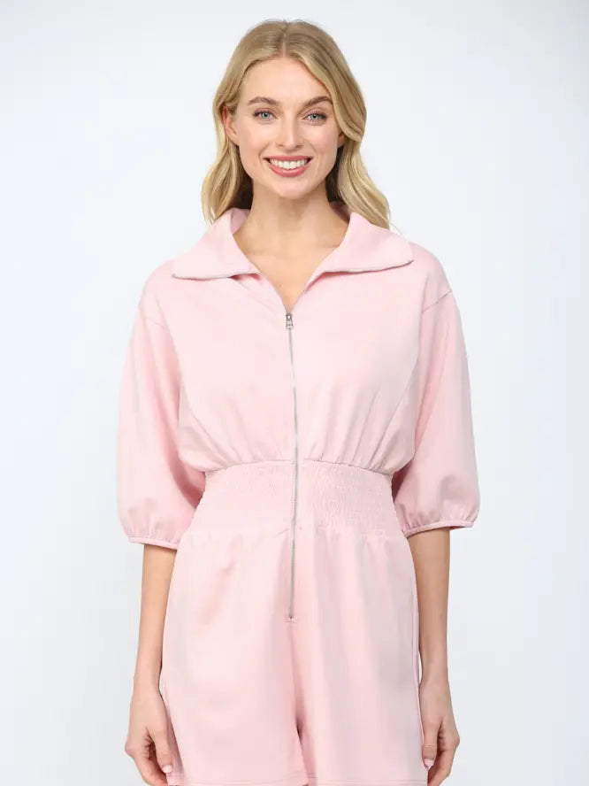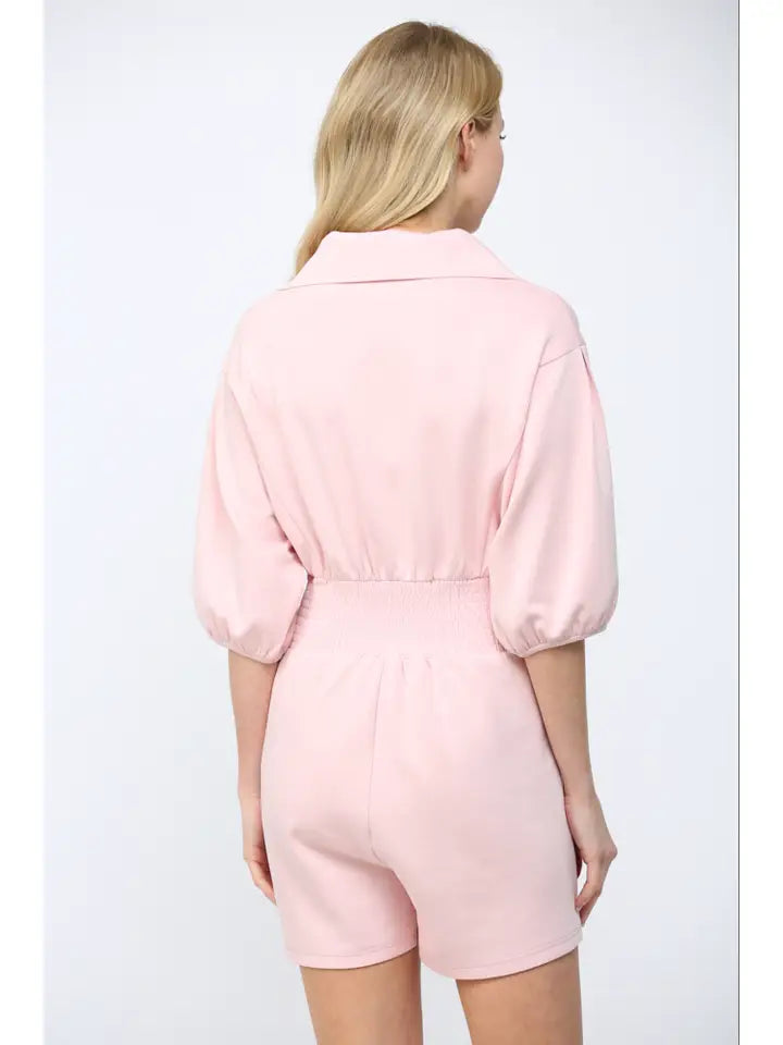 You'll be Galentine's Day ready in this soft pink romper! With its baby pink lightweight material, half puff sleeves, collared zip neckline and ruched waist, the Rena Smocked Romper is a piece you'll be wearing time and time again.