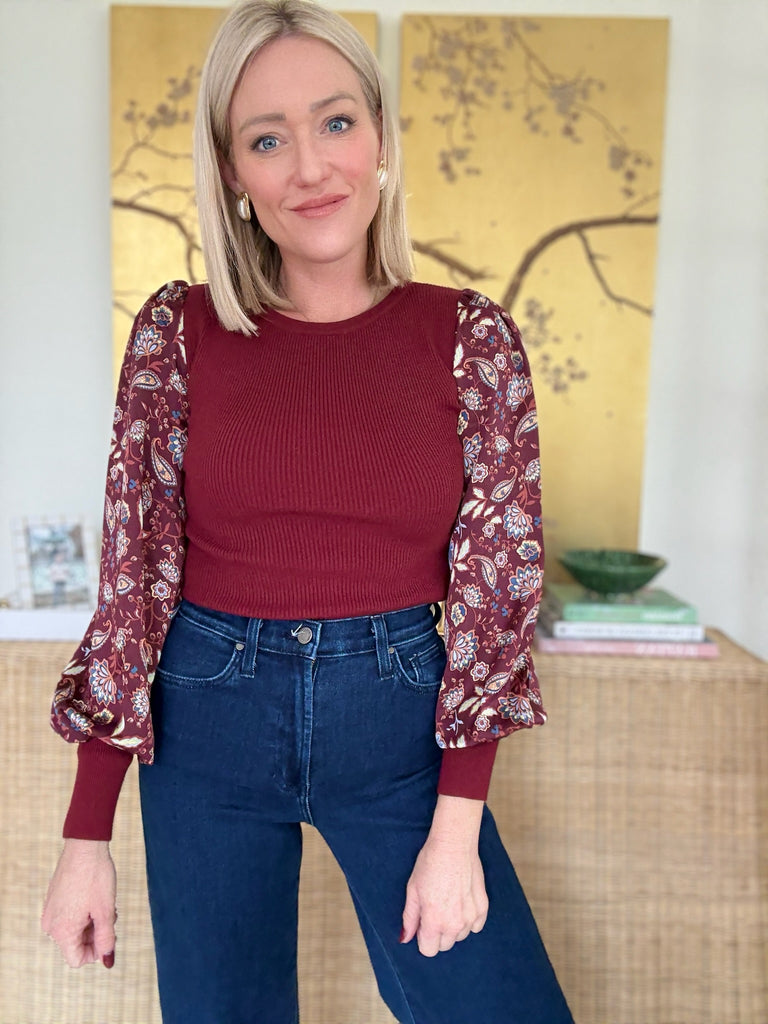 We are loving the way the sleeves of the Rosewood Top make a statement! Featuring a solid knit bodice in a wine red color, and floral balloon sleeves this piece is the peerfe4ct addition to your closet.
