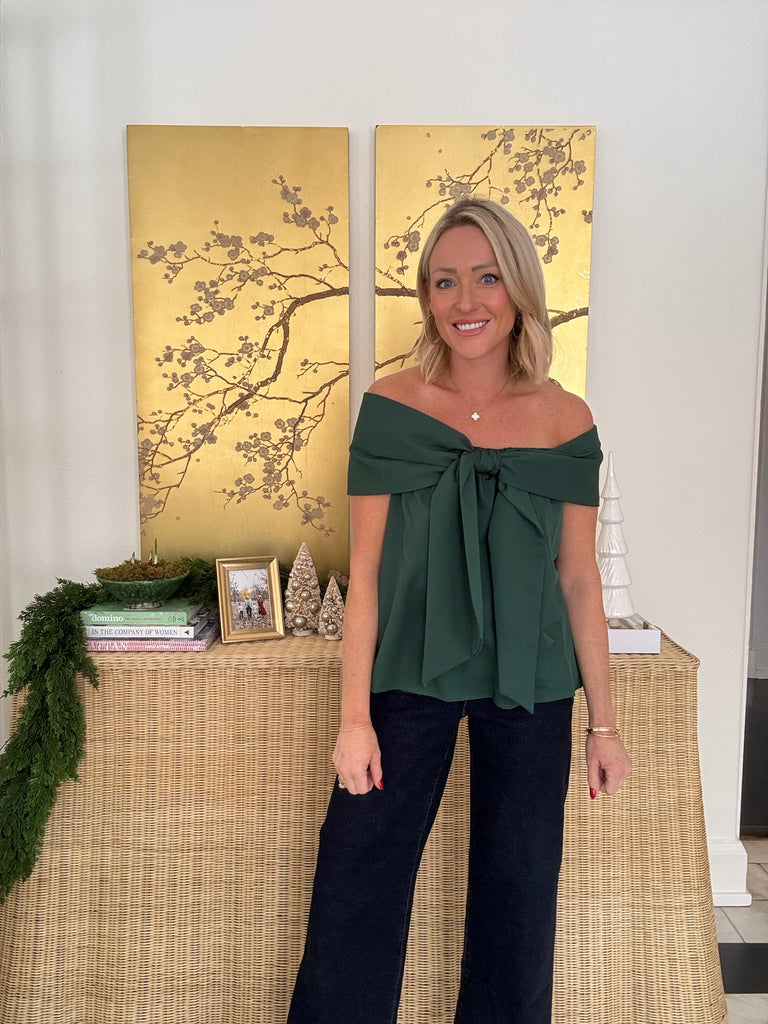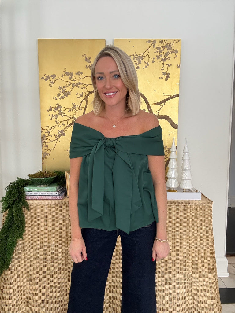 The Saylor Bow Tie Top is an ultra chic addition to your closet! Featuring an evergreen material, off the shoulder sleeves and bow bodice, this piece is a must have for your holiday.