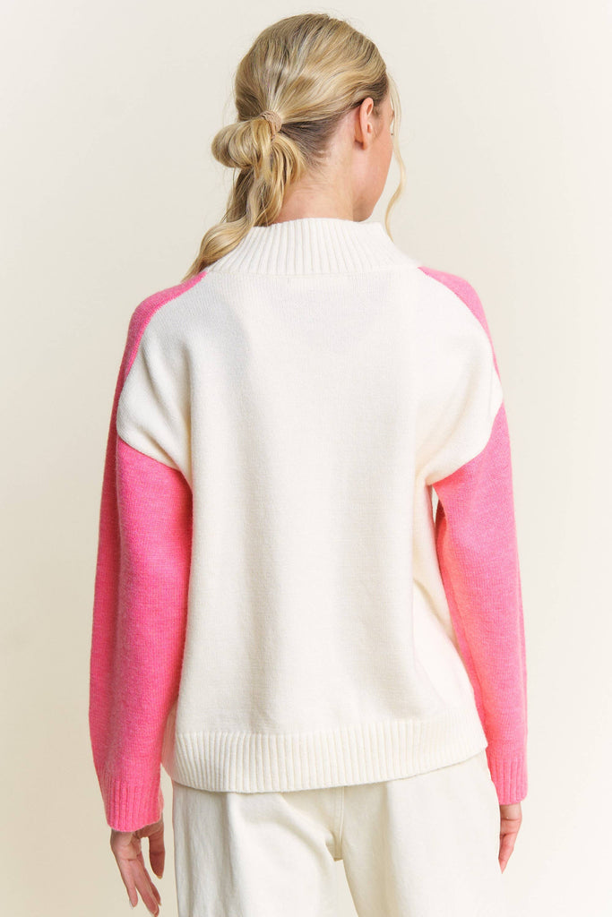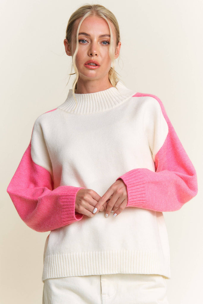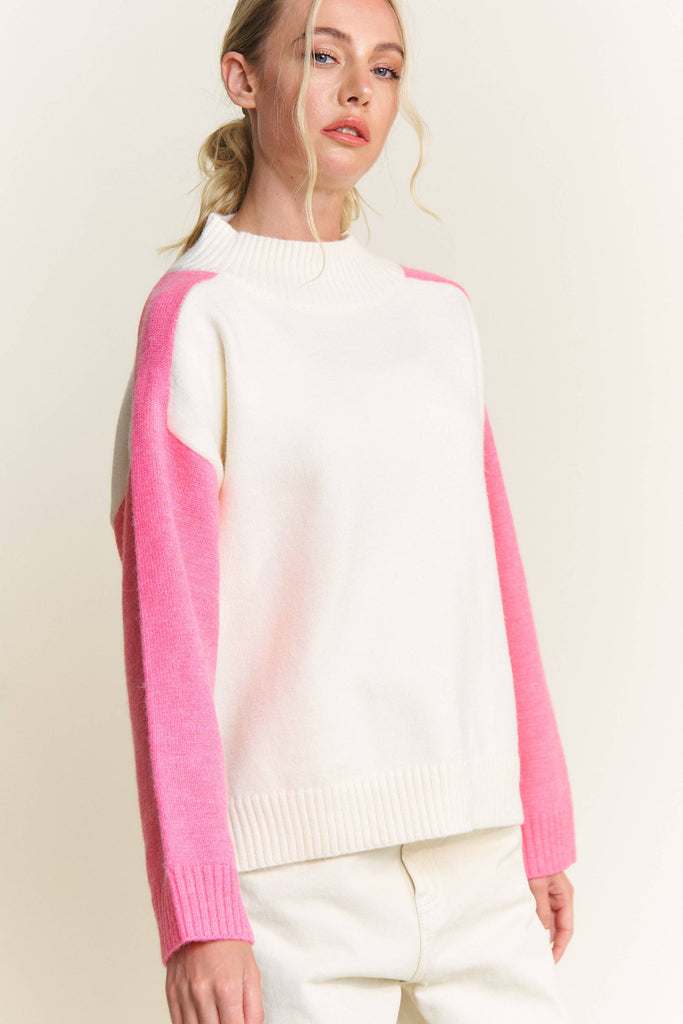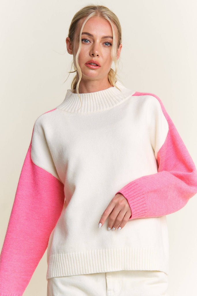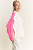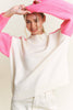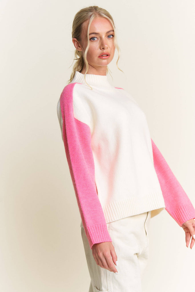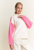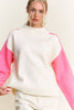 Make your look colorful with the Sawyer Contrast Sweater! This cream colored knit features and oversized fit and hot pink sleeves.