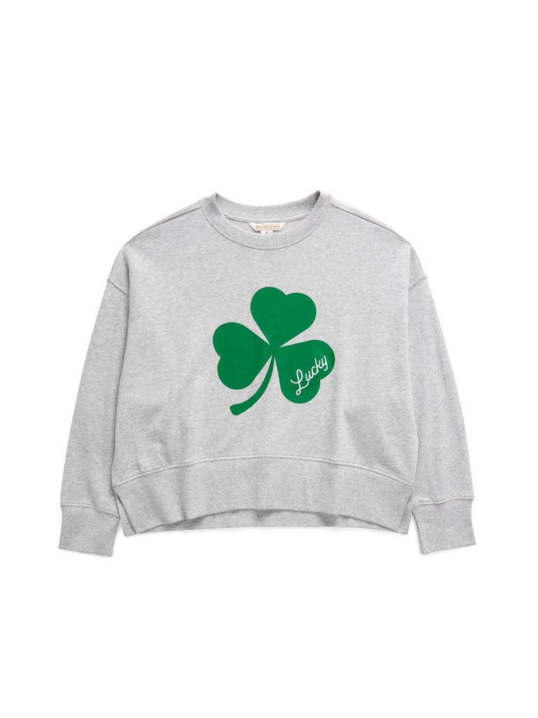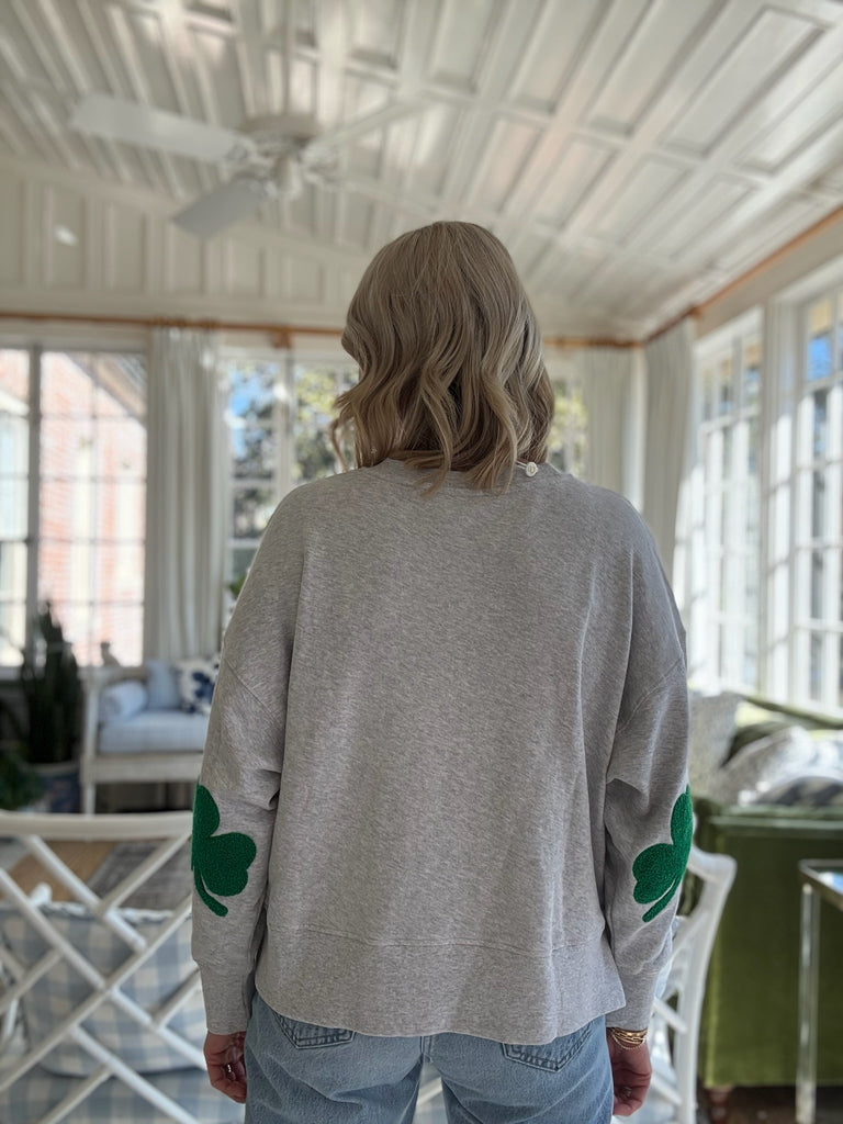 Your St. Patrick's Day is now in store at Dress & Dwell! This grey pullover sweater features a shamrock graphic on the bodice.