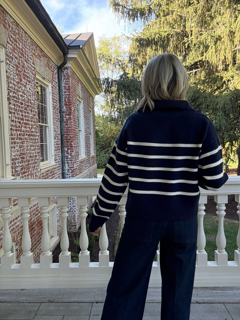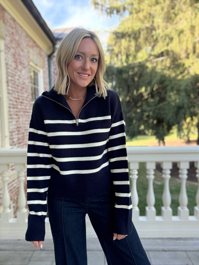 You'll be giving off all the collegiate vibes in the Dylan Stripe Sweater! With its chunky knit in navy and cream, collared neckline a front zipper this sweater is an instant add to cart.