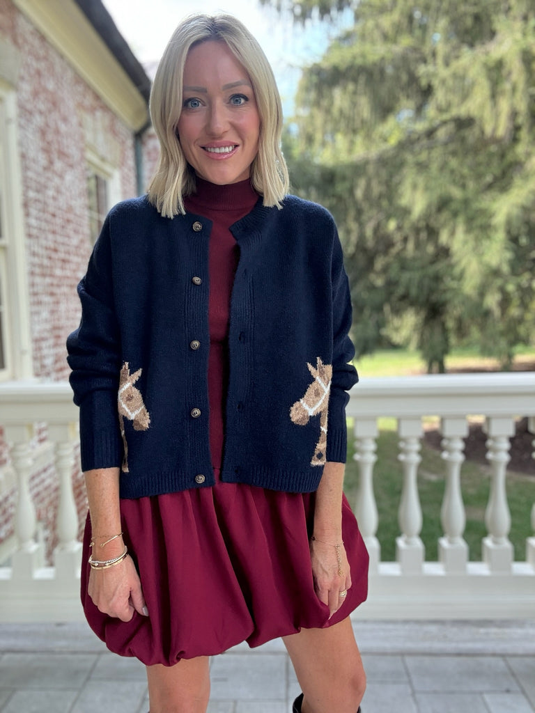 Show off your love of the bluegrass state with the Harrison Horse Cardigan! Horse motif long sleeve button-front sweater top features ribbed neckline, hem, and sleeve openings. Unlined. Knit. Non-sheer. Medium weight.