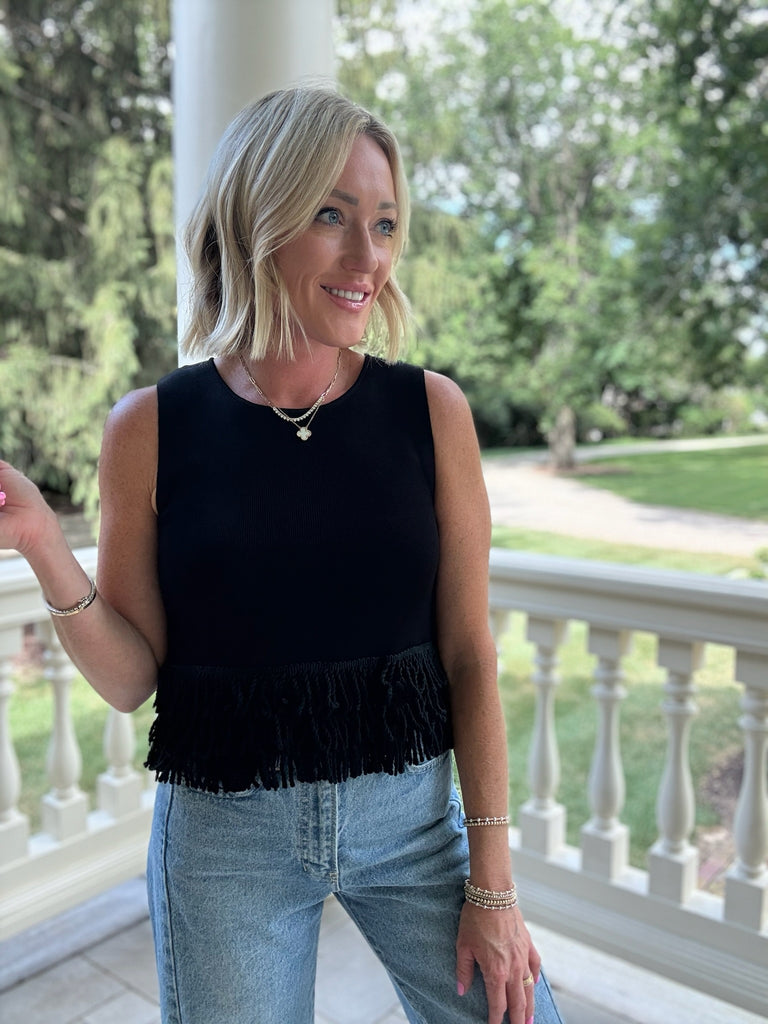 Make a statement in the Allison Fringe Top! This lightweight knit features a sleeveless bodice, and cropped hemline with fringe accents. Style with your favorite jeans for a ready to wear look!