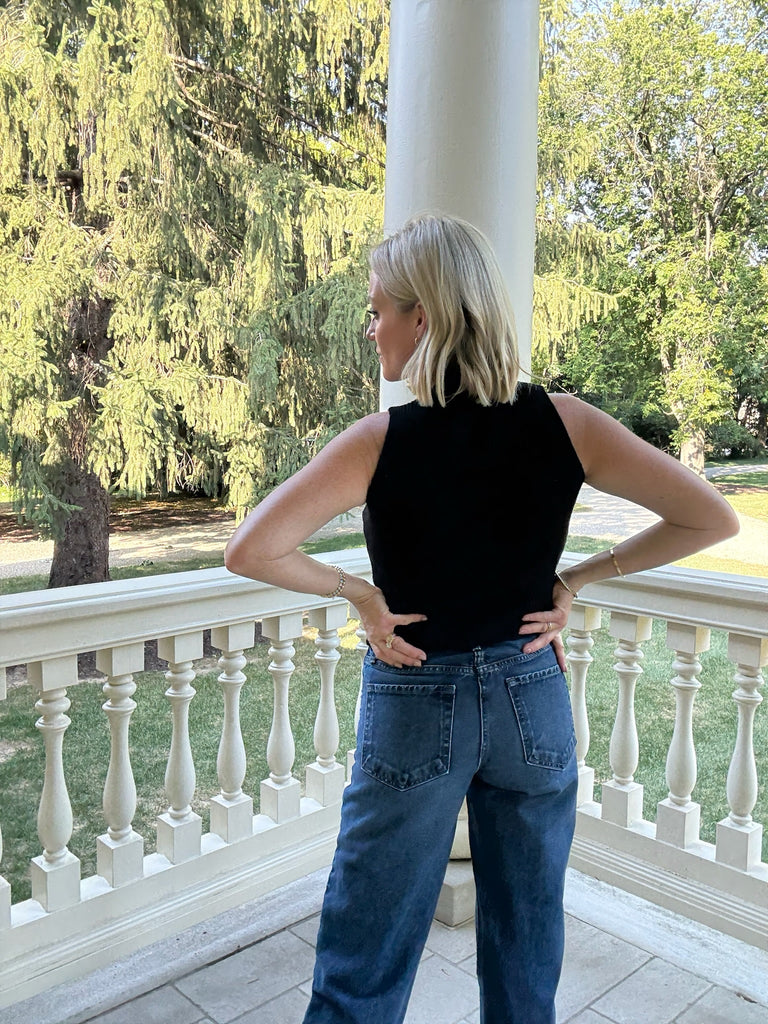 The perfect layering piece has just arrived at Dress & Dwell! With its plush black knit sleeveless bodice and mock neckline the Bailey Top is sure to be a Fall staple.
