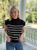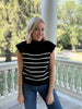You all loved this piece so much we brought it back in a new neutral colorway! This black and white stripe knit features a mock neckline and sleeveless bodice. Dress up or down to match any occasion.