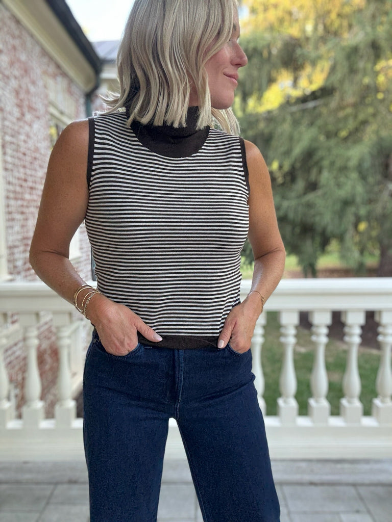 There is something so classic and sophisticated about the Cornelia Stripe Top. With its contrasting black and tan striped bodice, sleeveless design and high neckline this piece is so versatile, you'll be wearing it time and time again.
